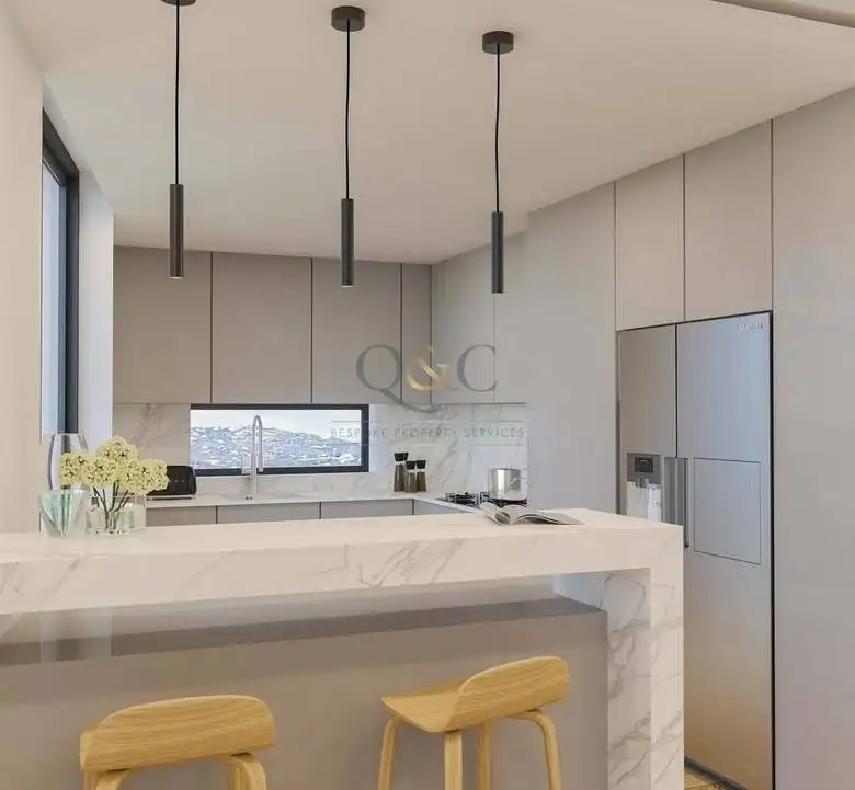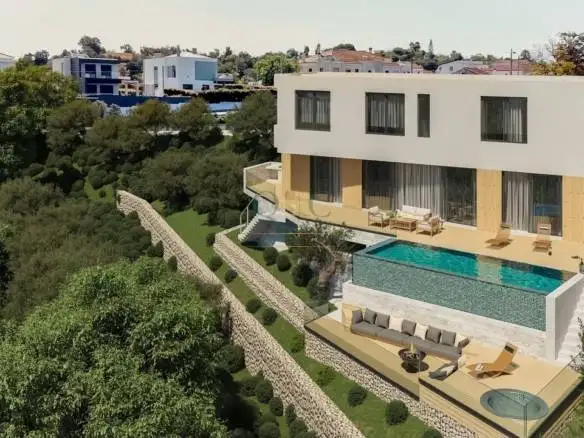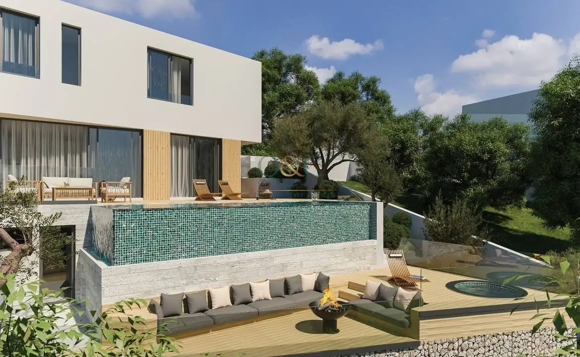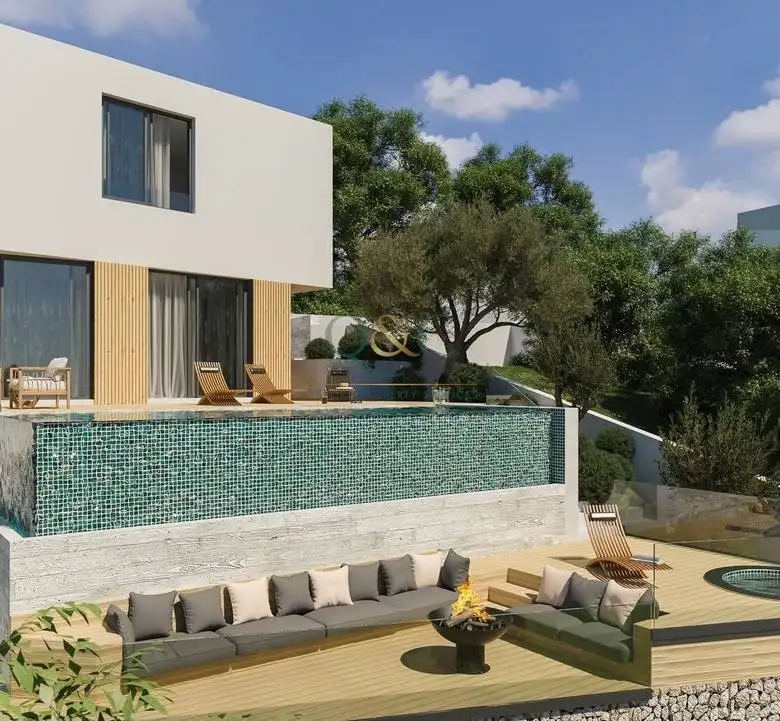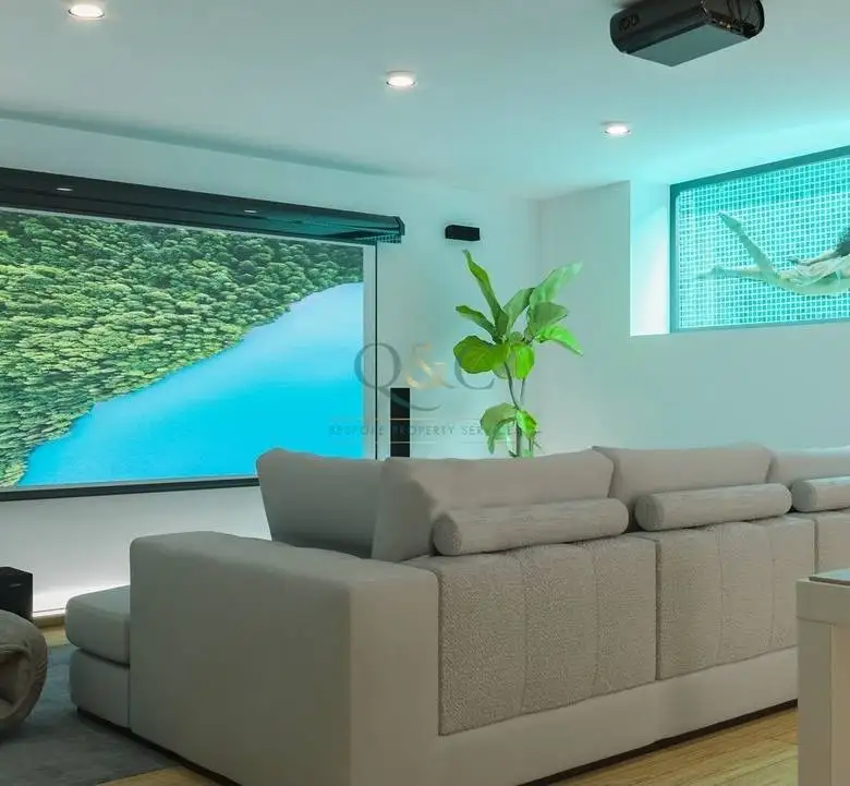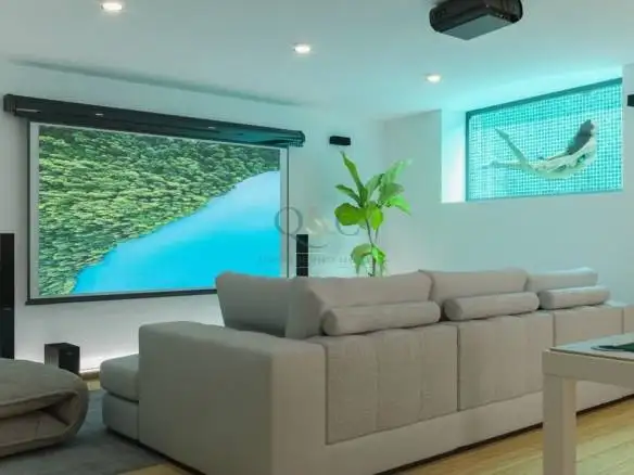 The first floor features three suites designed for maximum comfort and relaxation. The ground floor includes an open-plan kitchen and living area, benefiting from generous natural light that extends the interior spaces to the exterior, highlighting the infinity pool. Leisure and entertainment are focused on the lower floor, which includes a cinema/games room with direct access to the solarium and jacuzzi.