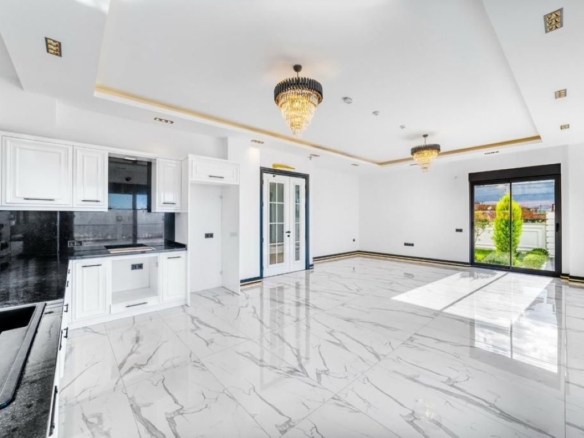 This exquisite luxury villa in Kargicak Alanya, Alanya, offers a luxurious living experience with stunning panoramic views of the Mediterranean Sea and the lush green landscape. The spacious living area is designed for comfort and style, featuring large windows that fill the space with natural light. Each bedroom comes with its own en-suite bathroom, ensuring privacy and convenience. The modern kitchen is equipped with premium appliances, making it perfect for culinary enthusiasts who enjoy entertaining.