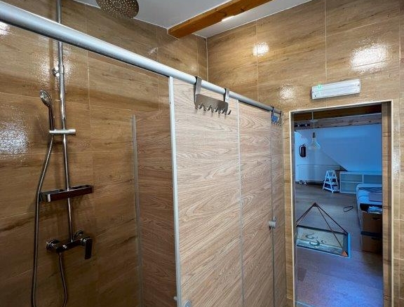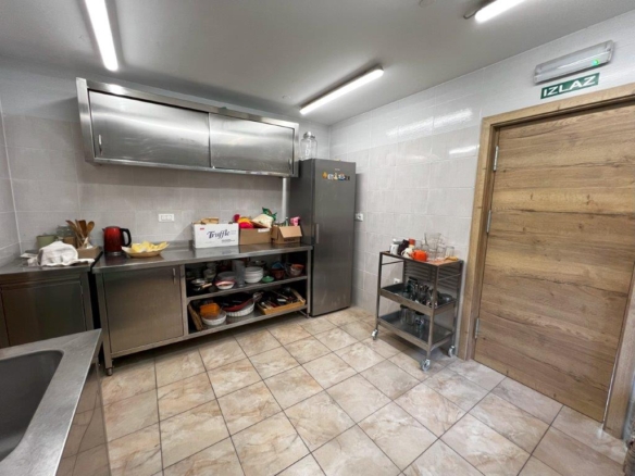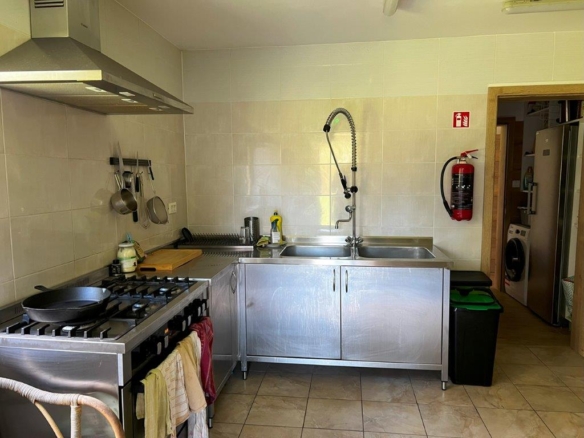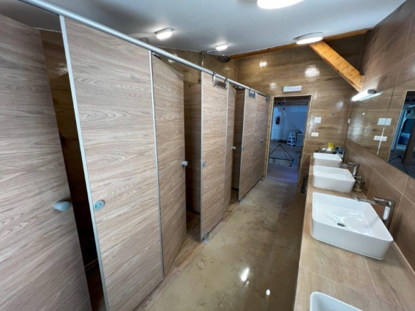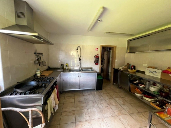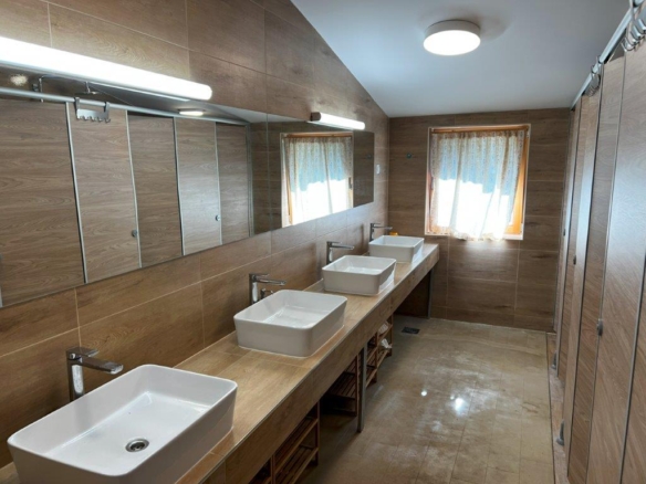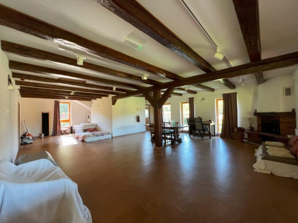 The main building covers an area of 342,80 m2. The ground floor of 187,75 m2 comprises entrance hall, kitchen, yoga room, large room with open fireplace, two toilets (M/F), bathroom with shower, cloakroom and boiler room. The first floor of 155,05 m2 comprises one double room, two triple rooms, a bedroom with eight beds, a bathroom with four showers and four washbasins, three WCs and a common living room.