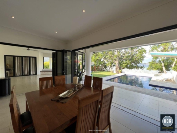 A stunning architecturally designed home constructed from concrete and steel to the highest structural standards for both earthquake and cyclones. This executive level home boasts 5 large bedrooms & 5.5 bathrooms and includes an external granny flat, office, kids’ playroom, media room, dining room, living room, Bi-fold CrimSafe* enclosed terrace, pool, double carport, double garage with single roller door and storage room (Condo/ Granny Flat above). Boasting your own private pristine white sandy beach frontage, a 20m jetty and a small boat mooring right out the front in Port Vila Harbour. It is located at the private, gated Worowloa Estate.