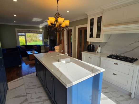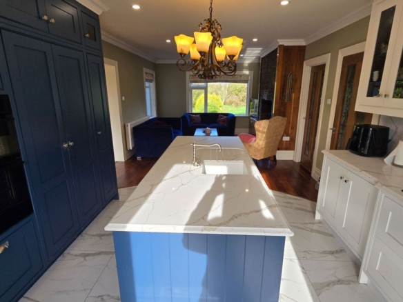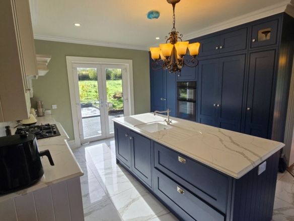 kitchen area – tiled flooring, centre island with quartz top and built in sink and drainer and floor level storage. Gas hob with quartz counter top and back splash, floor and eye level storage units and built in dishwasher. Wall units with built in fridge, electric ovens and storage units. Patio doors to rear garden.