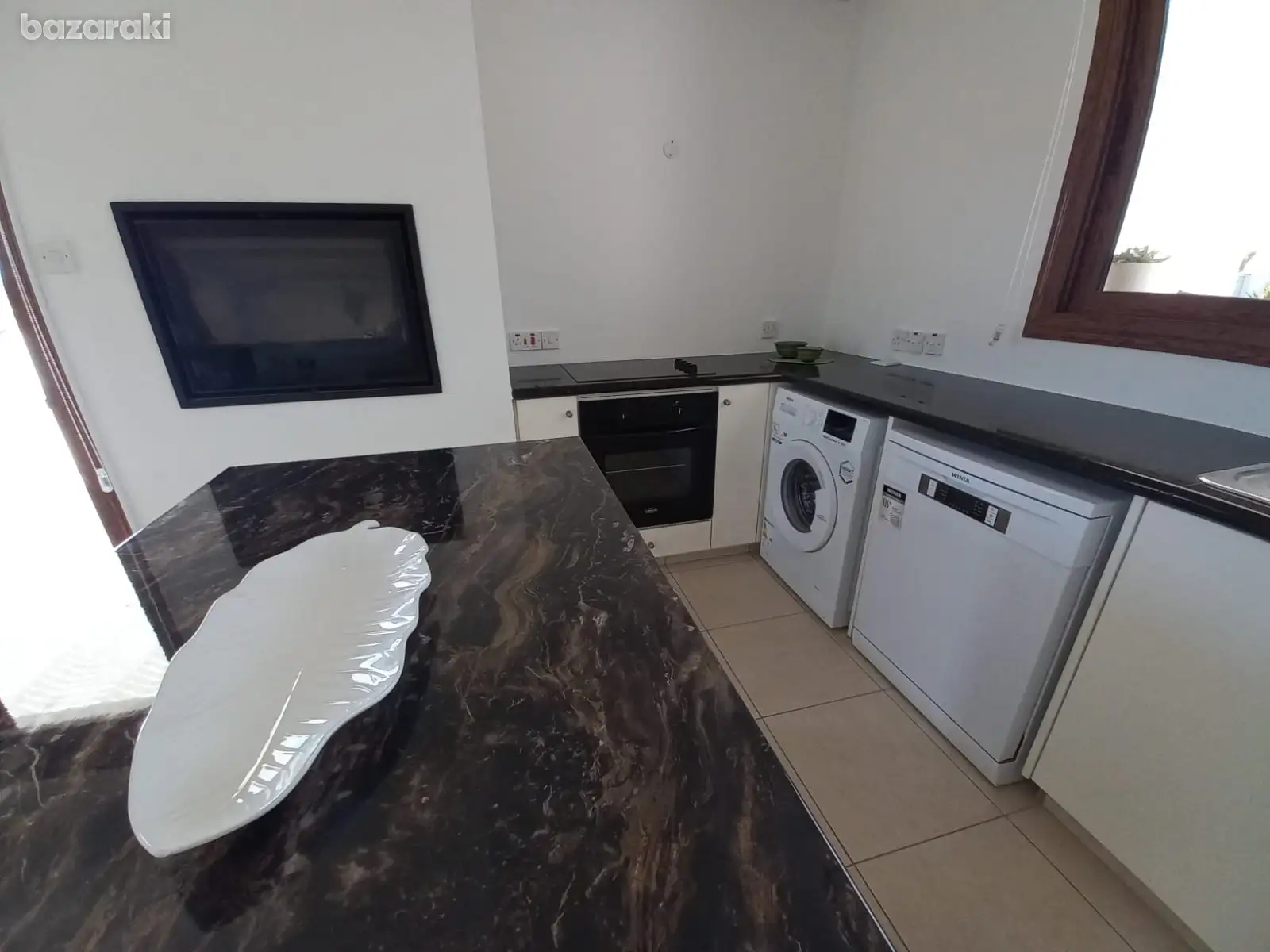 The kitchen is a gourmet’s dream, fully equipped with top-of-the-line appliances and high-end finishes. It features a stunning granite countertop made from granito assoluto, an induction hob, a steamer, and a dishwasher. This is a space where you can create culinary masterpieces with ease, all while enjoying the views. A built-in washing machine is also conveniently located in the guest bathroom, adding to the apartment’s practicality and functionality. For cooler evenings, a cozy wood-burning fireplace provides a warm and inviting focal point, perfect for relaxing and unwinding.