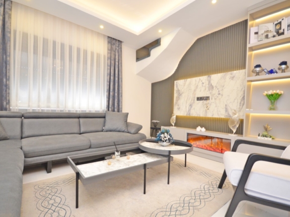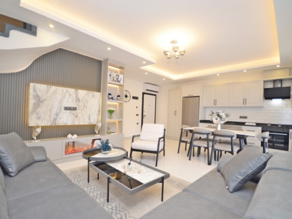 Duplex for sale in Alanya Oba – This fully furnished 2+1 duplex for sale in Alanya Oba is located in the prestigious Kavi Dreams Residence. Spanning 111 m² over the 4th and 5th floors, the apartment features 3 bathrooms, 3 WCs, and 2 balconies. The residence offers a wide range of amenities, including indoor and outdoor pools, a Turkish bath, a sauna, a Jacuzzi, and a fully equipped gym.