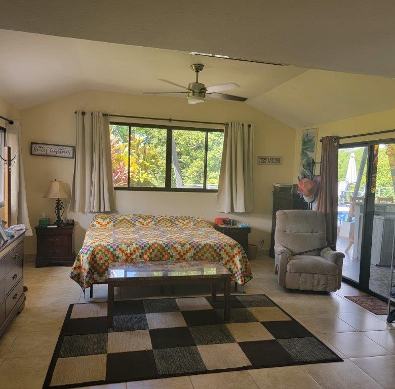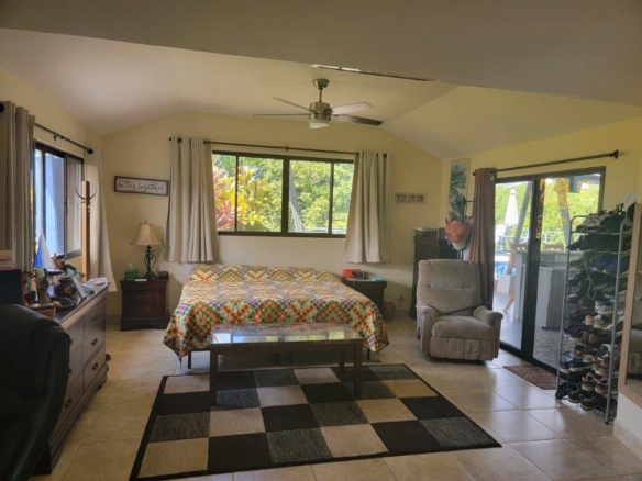 The master bedroom boasts breathtaking ocean and river valley views on one side with sliding doors out to the party pavilion on the other. It also features built-in his and her desks and a lavish master bathroom featuring an oversized shower area with two separate shower stations, including one with a sitting area. This bedroom also has ample closet space with a custom built wall closet and a separate large walk-in closet with a metal door, making it convenient to use as an owners’ lock off, if you decide to vacation rent your home when you are not in residence.