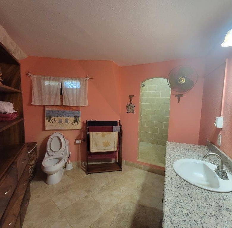 This spacious home features three bedrooms, with two guest rooms upstairs sharing a Jack and Jill bathroom, and the master bedroom on the first level with a large recently remodeled en suite bathroom. All three bathrooms in the house have been recently renovated with custom cabinets with granite countertops and bidet-equipped toilets for optimal comfort and hygiene. The guest bathroom adjacent the laundry room and garage is conveniently located near the doorway leading to your fabulous entertainment pavilion and pool deck.