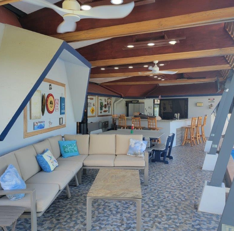 2. Inviting Dining and Seating Area: In addition to the huge bar area surrounding the kitchen, a spacious dining and seating area beckons, offering a perfect setting for meals and vibrant conversations. This seating area also boasts custom remote-controlled shades, ensuring comfort even on the sunniest days.