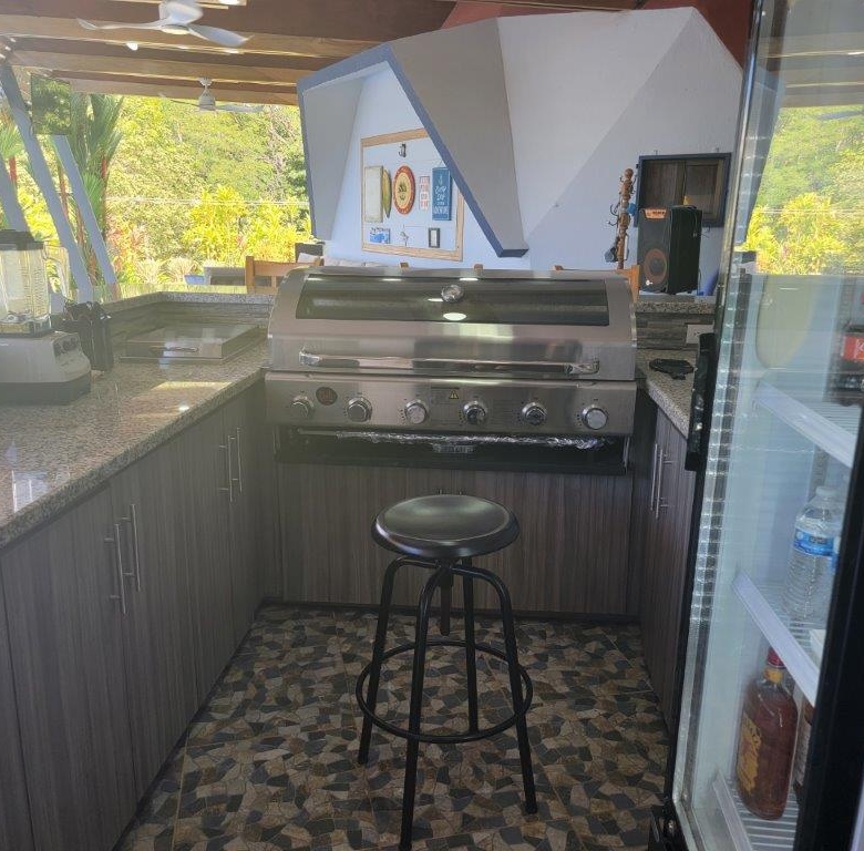 1. Expansive Kitchen: A focal point of outdoor entertainment, the pavilion boasts a massive 10’ by 10’ granite countertop kitchen, custom-built with convenience in mind and bar stools all around. It features a built-in propane gas Bali BBQ, a separate gas cooktop, a double sink with hot and cold water, a large refrigerator and an abundance of custom cabinets. It’s a chef’s dream hub for culinary delights.