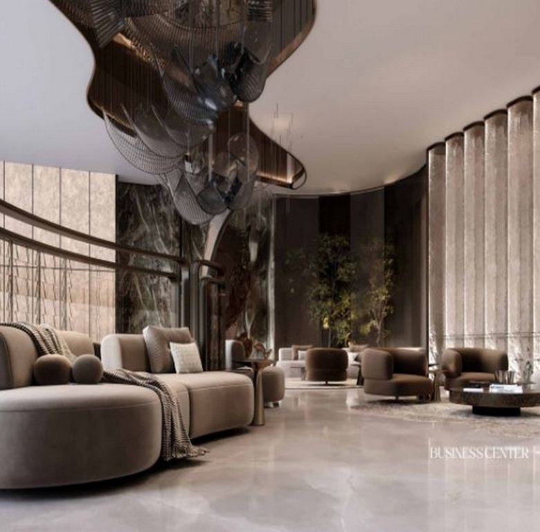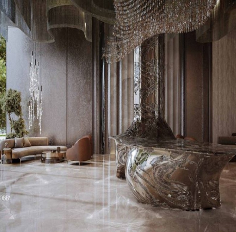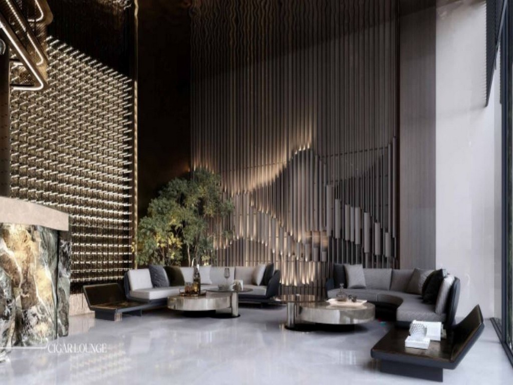 Ground Floor: A striking luxury lobby with Orobico and fluted white marble, crystal chandeliers, a business center, cigar lounge, and concierge services.