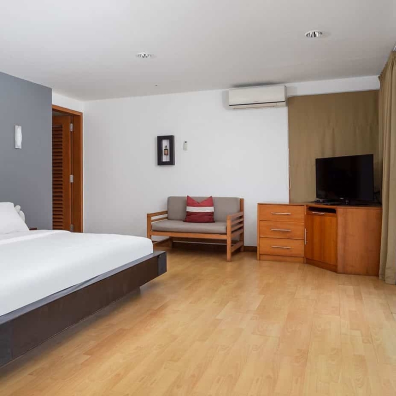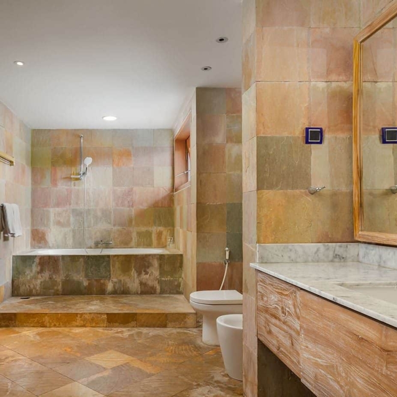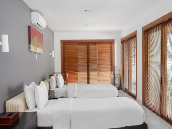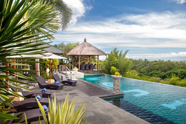 – A 25 x 4m private infinity pool with three outdoor relaxation gazebos set in lush tropical gardens.