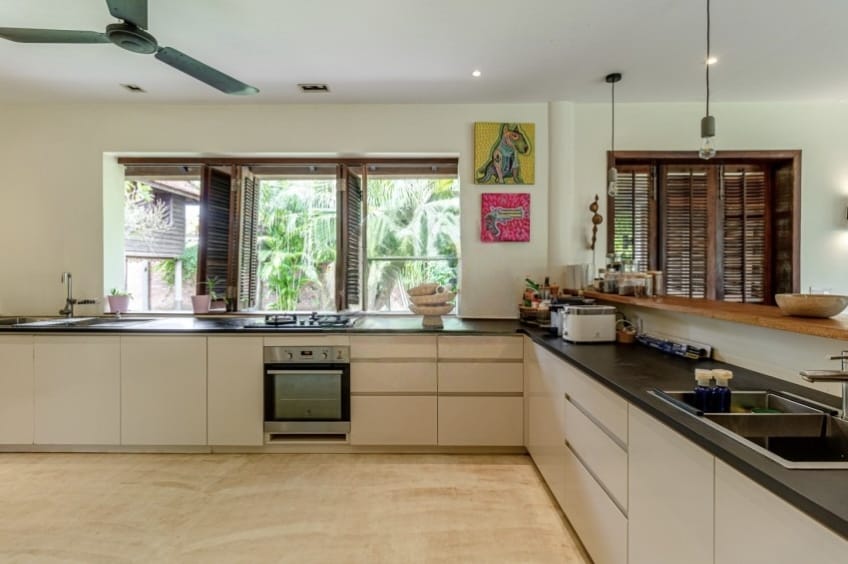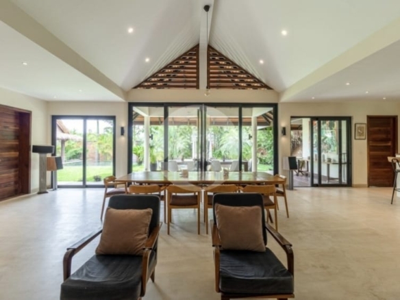 Open-Plan Living Area: Spacious lounge, complete 10-seater dining setup, and peninsula-style kitchen with sink, cooker, oven, and pantry all built in for efficiency.