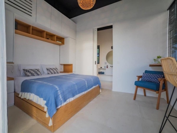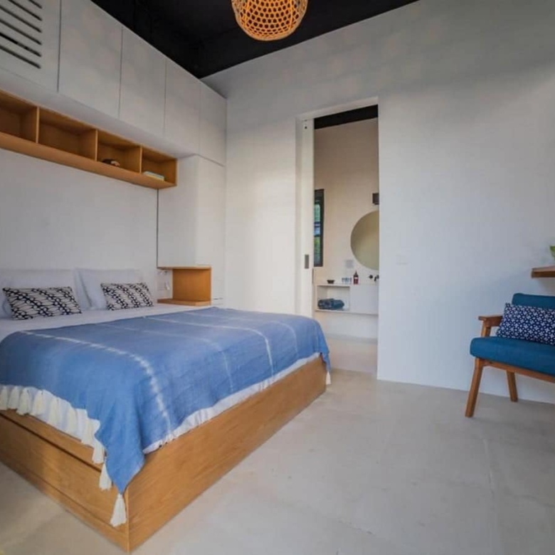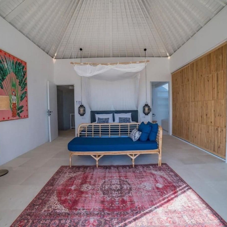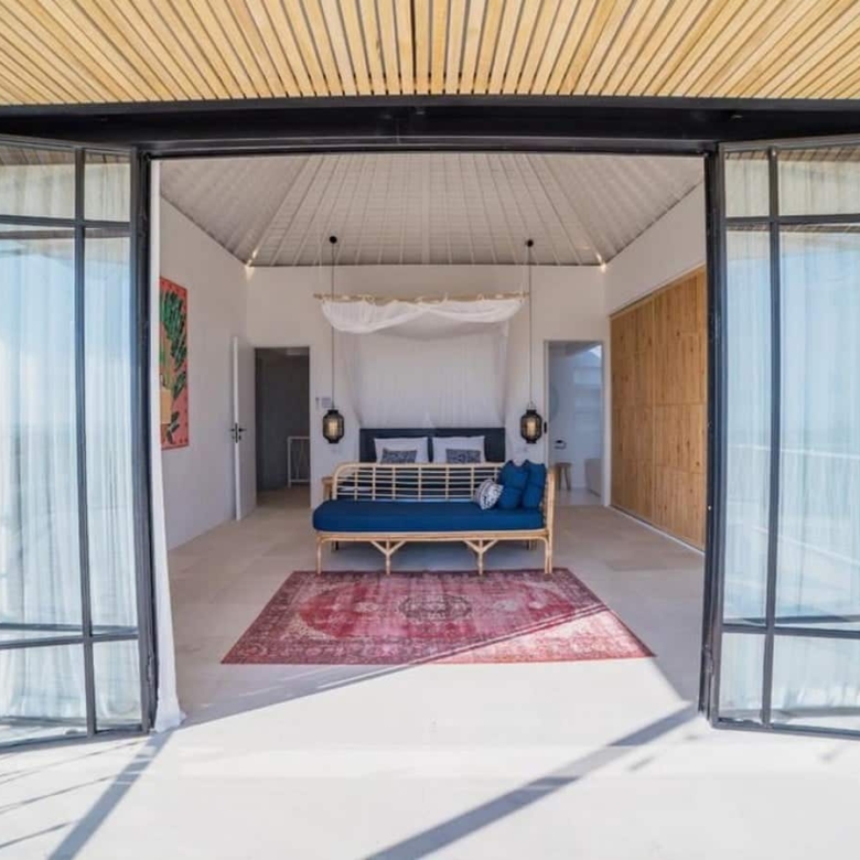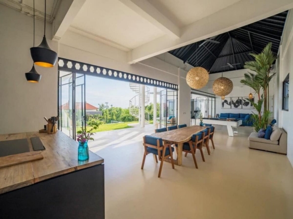 The stunning property is built to the highest standards and is surrounded by other luxury villas and lots of greenery. The entrance of the villa is recognizable by the art on the wall. Stepping inside you will find a large living room with a fully equipped modern kitchen, billiard table and lounge area. The living room can be opened entirely or closed off with large glass folding doors ensuring airflow throughout. There are two rooms on the ground floor and the third bedroom has bunk beds that kids would love. On the second floor you will find two identical master bedrooms—king-size beds, 42-inch TVs and ensuite bathrooms with bathtubs. There is a massive balcony that connects both rooms. On a clear day, you can see Java and the volcanoes of Bali. The villa comes fully furnished.