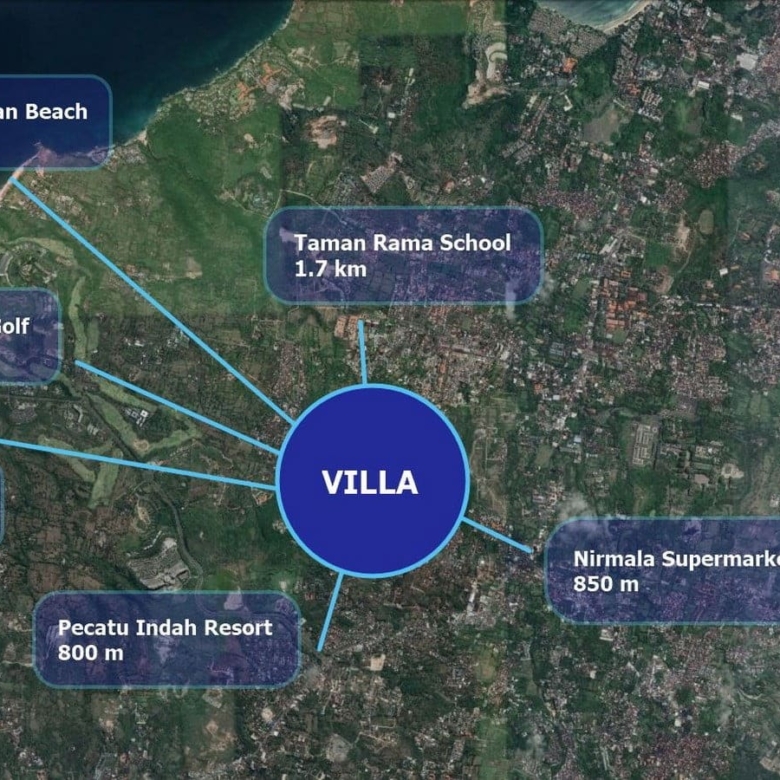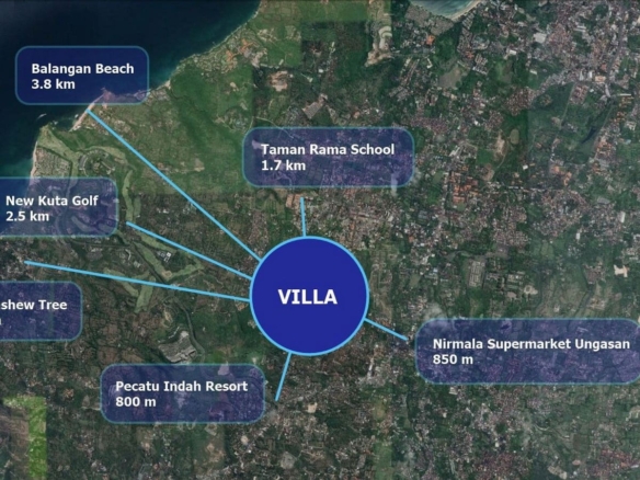 Nearby: Taman Rama School 1.7 km, Sidewalk Shopping Center 2.7 km, New Kuta Golf 2.7 km, Rock Bar 3.8 km, Balangan Beach 3.8 km, Jimbaran Bay 4 km, Udayana Hospital 4.3 km.