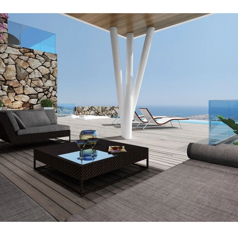 Set across three levels, the villa is surrounded by landscaped gardens and features a private overflow swimming pool that blends seamlessly with the horizon. Designed to maximize natural light and panoramic beauty, nearly every space opens to the breathtaking 180º views of the Mediterranean Sea.