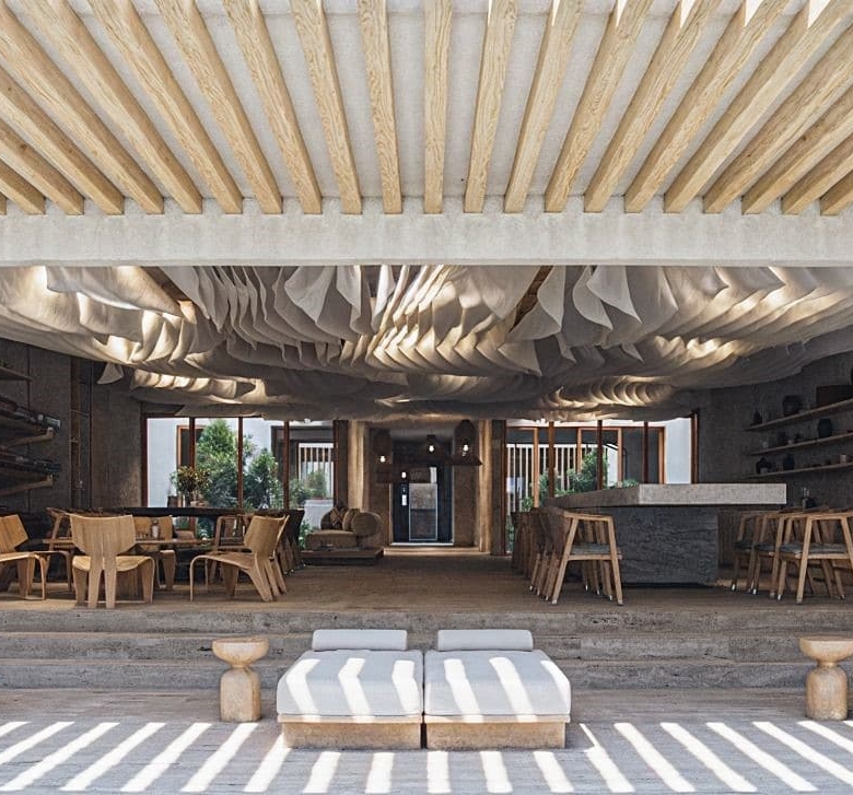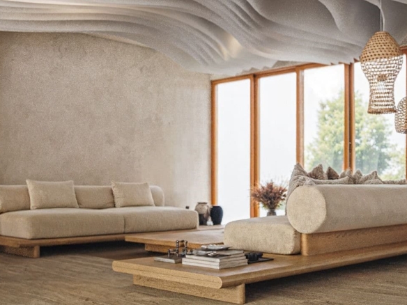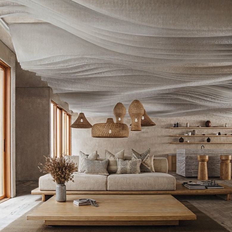 Finishes include travertine marble flooring, beige granite countertops, and custom cabinetry made from light-toned tropical wood. Soft textures like yute-accented feature walls and matte black fixtures add understated sophistication.