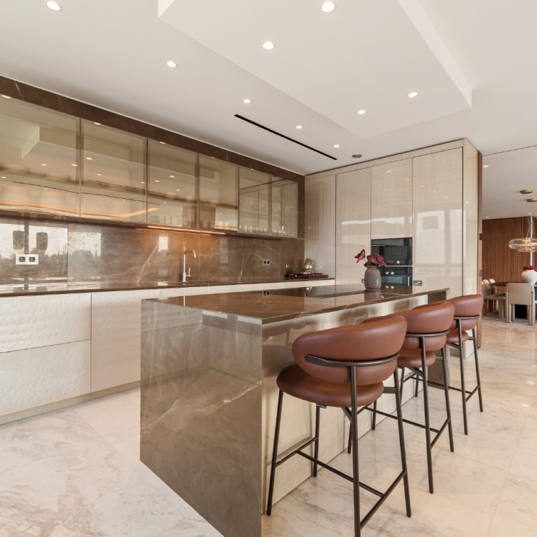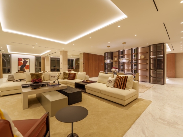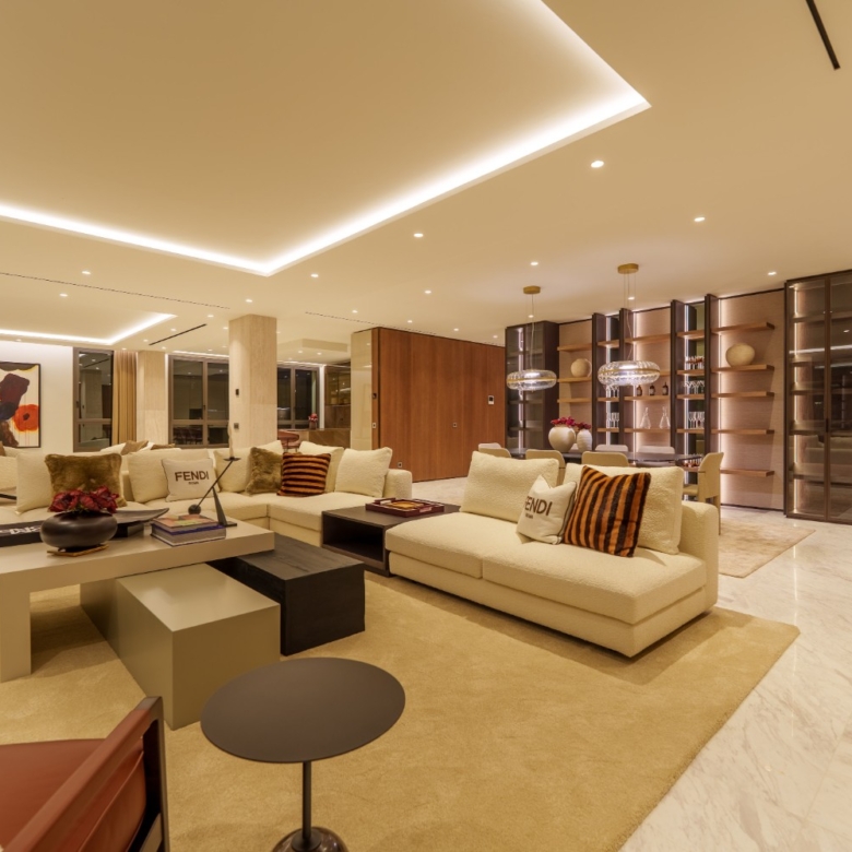 This remarkable residence instantly captures the essence of true luxury, beginning with an impressive entrance hall that sets the tone for the grandeur within. The expansive living room, notable for its exceptional size, evokes a sense of boundless space and freedom. Large marble floors throughout the property enhance the elegant atmosphere, while the kitchen—expertly designed and furnished by Fendi Casa—showcases refined craftsmanship at its finest.
