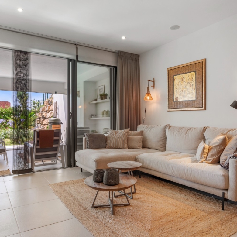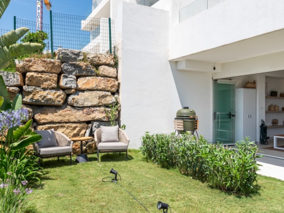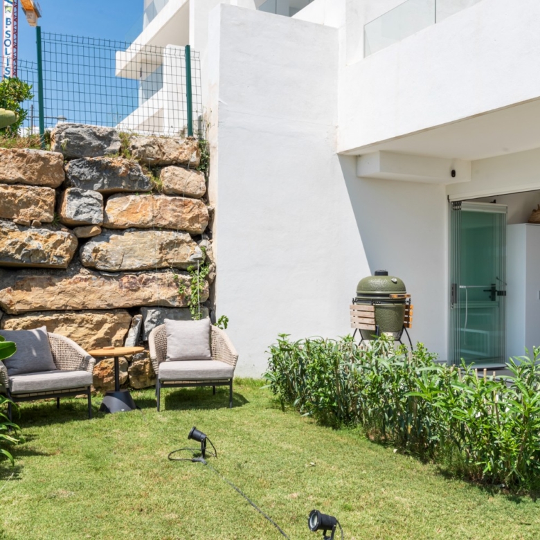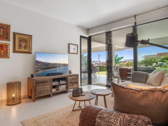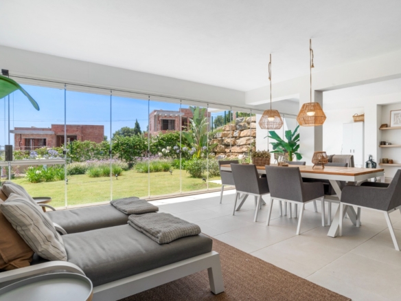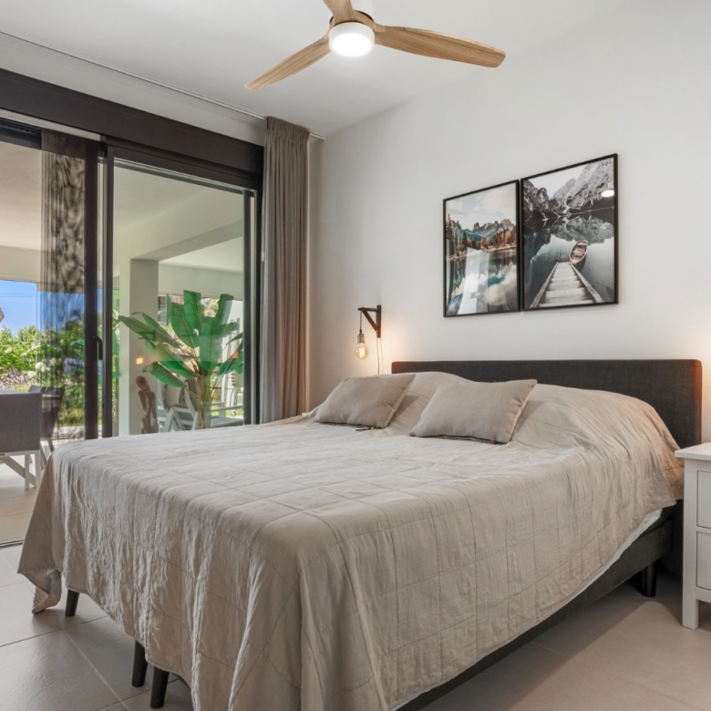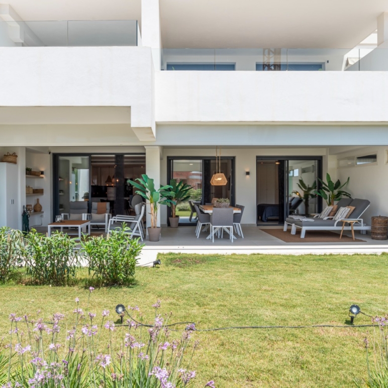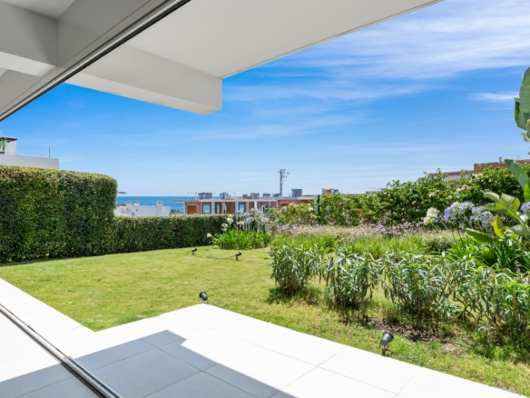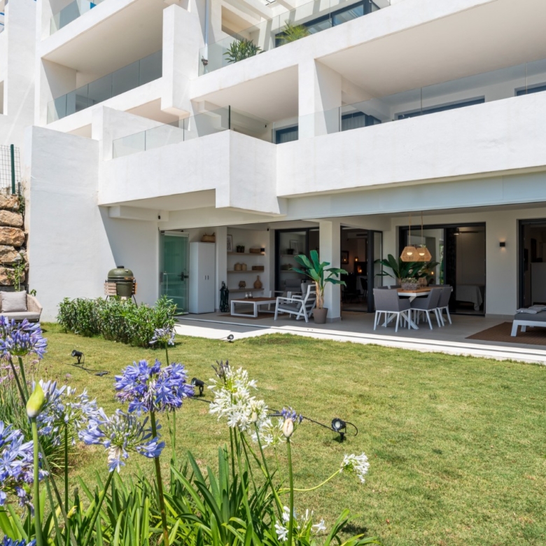 This beautifully presented 2-bedroom ground-floor apartment is located in the sought-after Mirador del Golf development, next to Estepona Golf Club. Built in 2021, the property offers a perfect blend of contemporary design, comfort, and privacy in a peaceful setting just minutes from Estepona town, the beach, and local amenities. With a southwest orientation, it enjoys all-day sun and lovely views over the manicured gardens, the surrounding mountains, and even a glimpse of the sea. The bright open-plan living and dining area seamlessly connects to a fully fitted kitchen with Siemens appliances, while the master bedroom features an en-suite bathroom and the guest bedroom is served by a separate bathroom. A standout feature is the spacious 54 m² terrace enclosed with glass curtains, ideal for year-round use, which opens onto a private 90 m² garden beautifully maintained by the community and included in the community fees. Additional highlights include a private parking space, storage room, communal pool, gym, and secure gated entry. Offering the space and feel of a villa with the convenience and ease of apartment living, this property is perfect as a permanent residence or an elegant holiday home.