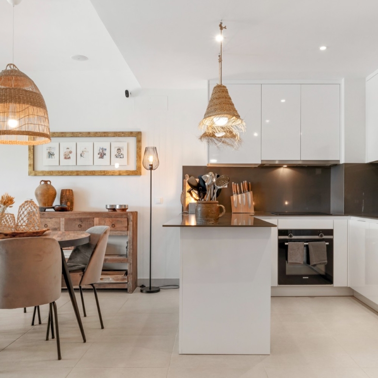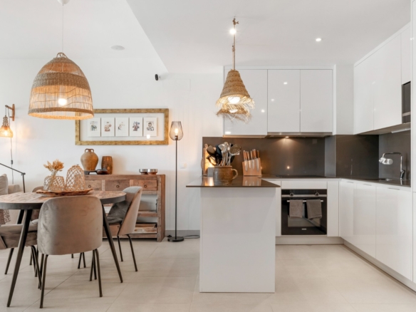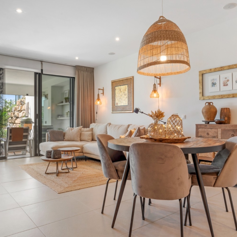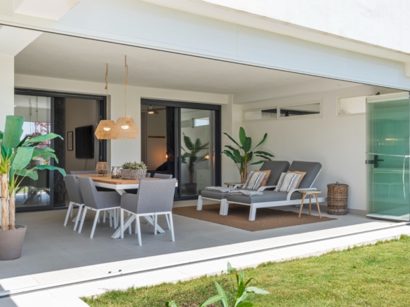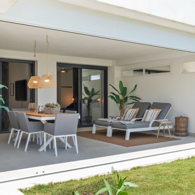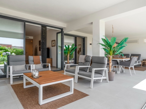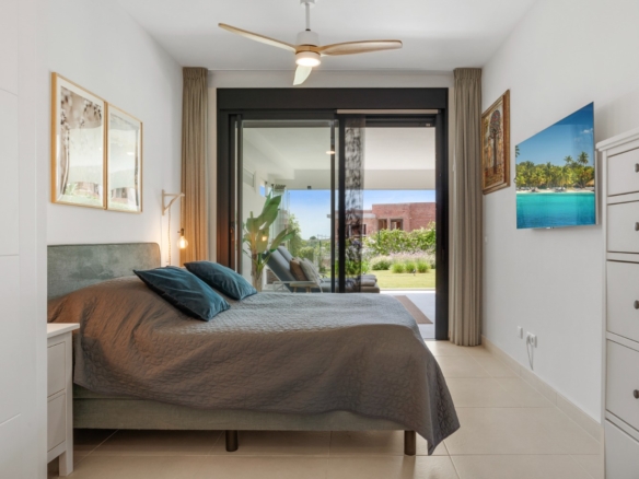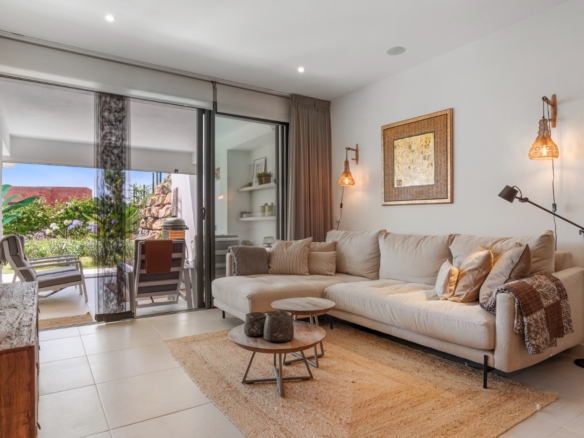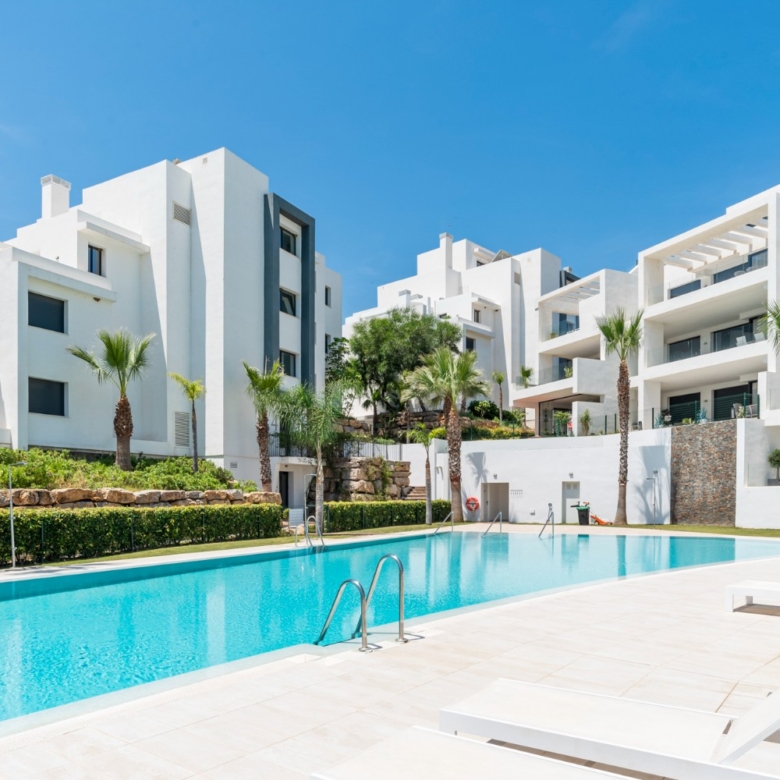 This beautifully presented 2-bedroom ground-floor apartment is located in the sought-after Mirador del Golf development, next to Estepona Golf Club. Built in 2021, the property offers a perfect blend of contemporary design, comfort, and privacy in a peaceful setting just minutes from Estepona town, the beach, and local amenities. With a southwest orientation, it enjoys all-day sun and lovely views over the manicured gardens, the surrounding mountains, and even a glimpse of the sea. The bright open-plan living and dining area seamlessly connects to a fully fitted kitchen with Siemens appliances, while the master bedroom features an en-suite bathroom and the guest bedroom is served by a separate bathroom. A standout feature is the spacious 54 m² terrace enclosed with glass curtains, ideal for year-round use, which opens onto a private 90 m² garden beautifully maintained by the community and included in the community fees. Additional highlights include a private parking space, storage room, communal pool, gym, and secure gated entry. Offering the space and feel of a villa with the convenience and ease of apartment living, this property is perfect as a permanent residence or an elegant holiday home.