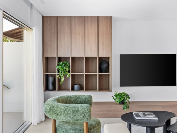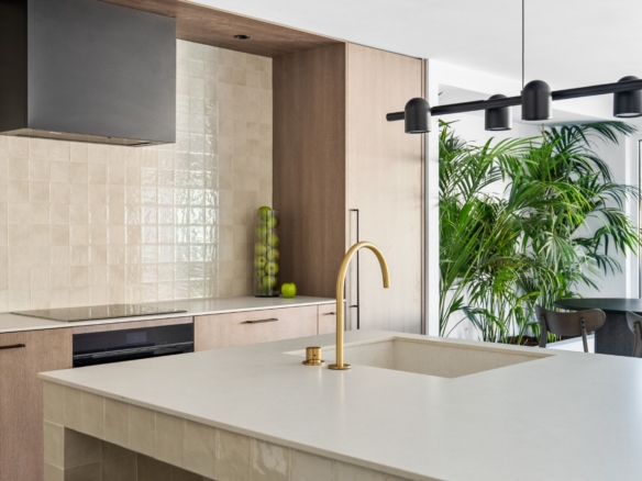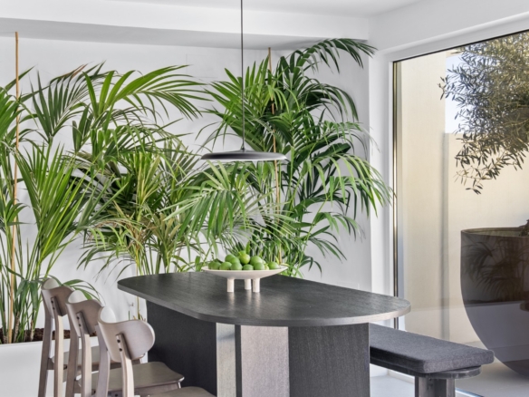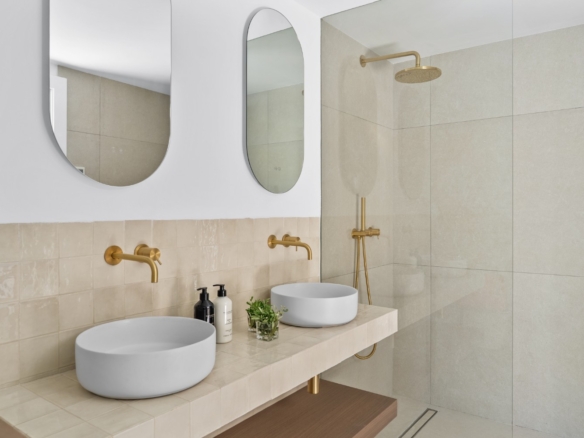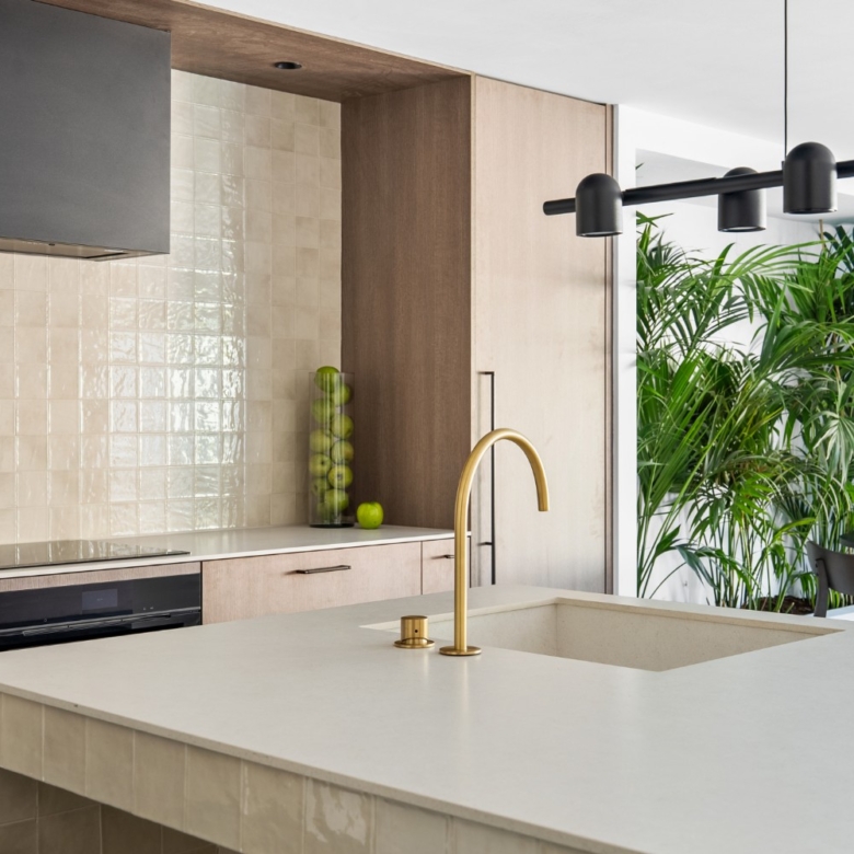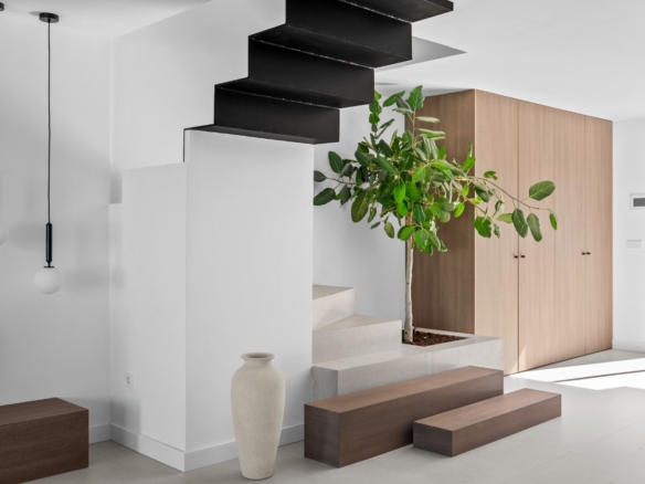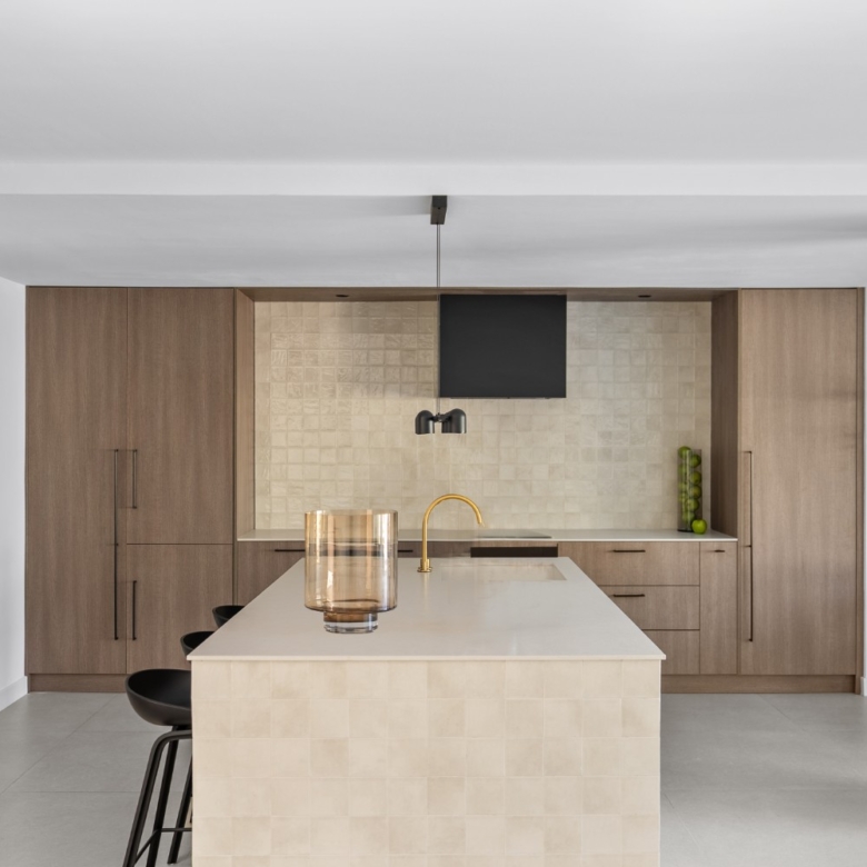 This property is perfect for year-round living or as a holiday home. The refined interior design combines earthy tones, matte black accents, smoked oak wood, gold details, and handcrafted zellige tiles, creating a sophisticated and timeless aesthetic. Upon entering, you’re welcomed by a striking staircase made of wood and metal that beautifully blends traditional craftsmanship with modern style. The entryway opens directly into the kitchen, dining, and living areas, all of which overlook a serene outdoor living space with a private pool. This seamless connection between the indoor and outdoor areas creates a peaceful, harmonious atmosphere.