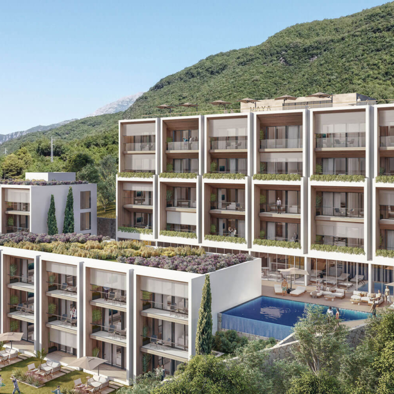 These modern two-bedroom apartments are located in the Maya Adriatic residential complex in Kumbor at the entrance of the Bay of Boka. The complex is in the embrace of the sun and sea, away from the city noise and bustle, close to the famous Portonovi residential area and luxury yacht marina. This complex impresses with its peaceful atmosphere, stunning natural beauty, and crystal-clear water. Unspoiled beaches and panoramic views of the Bay of Kotor create ideal conditions for vacation and accommodation.The development offers two different types of 56 residential units in three buildings. Its original architecture is designed to meet the highest standards of luxury and comfort, with meticulously designed interiors, lush gardens, and spacious balconies and terraces overlooking the sea, providing maximum comfort and value for your stay.Avaliable two-bedroom apartments:APARTMENT B-3, first floor, 54.34m²+ terrace 8.68m²APARTMENT B-4, first floor, 54.34m²+ terrace 8.68m²APARTMENT B-7, first floor, 54.34m²+ terrace 8.68m²APARTMENT B-15, first floor, 54.34m²+ terrace 8.68m²APARTMENT A-6, first floor, 54.93m²+ terrace 8.68m²APARTMENT A-7, second floor, 54.93m²+ terrace 8.68m²APARTMENT A-12, second floor, 54.93m²+ terrace 8.68m²APARTMENT A-18, third floor, 54.93m²+ terrace 8.68m²There is a shared outside infinity swimming pool with a sunbathing area, an inside swimming pool for all-year use, a SPA&Welnes area, a gym, and a rooftop bar ideal for parties and gatherings with family and friends. There are underground garages with car elevators and electric car chargers. In A Maya Adriatic complex, you will always be able to feel the magic of the Mediterranean away from the city’s noise and bustle. The complex is close to the sea, city center, and historical and tourist places thanks to its central location. This makes the beauty of living in Montenegro a real privilege.A Maya Adriatic complex presents a compelling investment opportunity. Montenegro’s booming tourism industry and increasing demand for luxury properties make your apartment a sound investment with high rental yields and capital appreciation potential. Contact us today for more information or to arrange a viewing. Experience the perfect blend of comfort, style, and cultural richness in this Kumbor development.