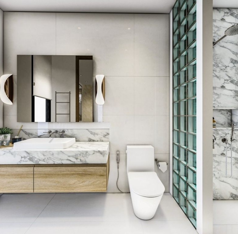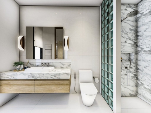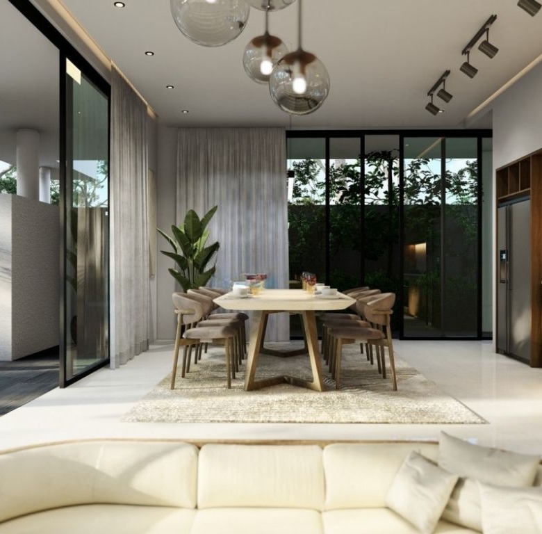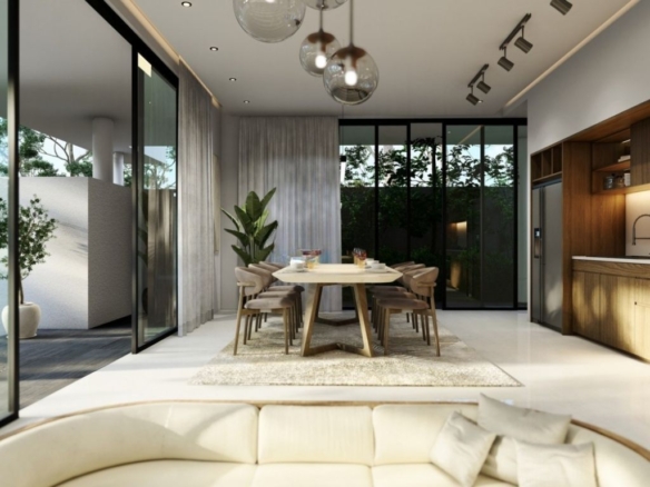 Built on 172.6 sqm of land with a 174.5 sqm two-level design, the villa features thoughtfully planned interiors that maximize space and natural light. The layout includes two spacious bedrooms and two elegant bathrooms with high-quality fixtures, rain showers, and modern single-sink vanities. The heart of the home is an enclosed sunken living area that flows into the dining space and a fully equipped modern kitchen, creating a warm and functional environment for everyday living and entertaining.