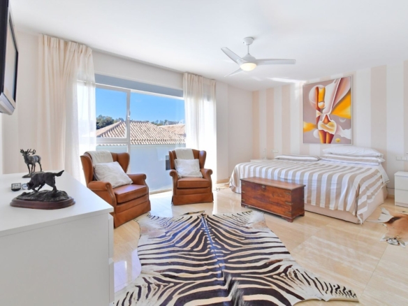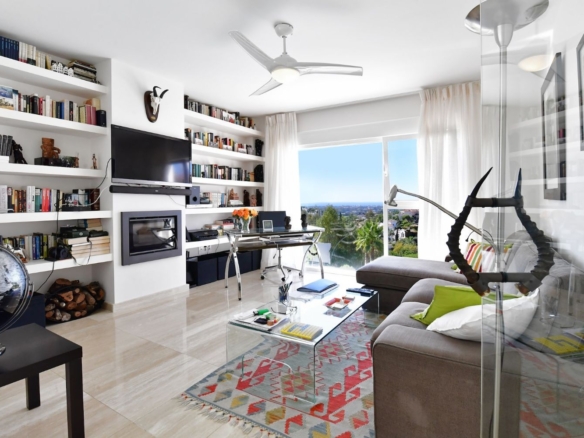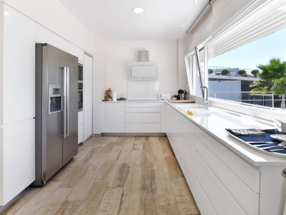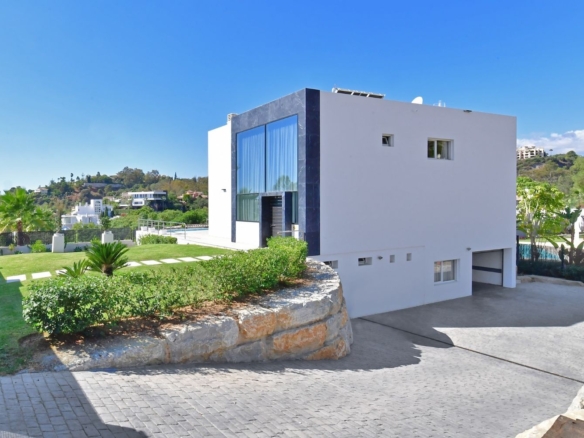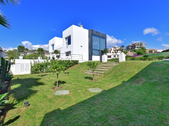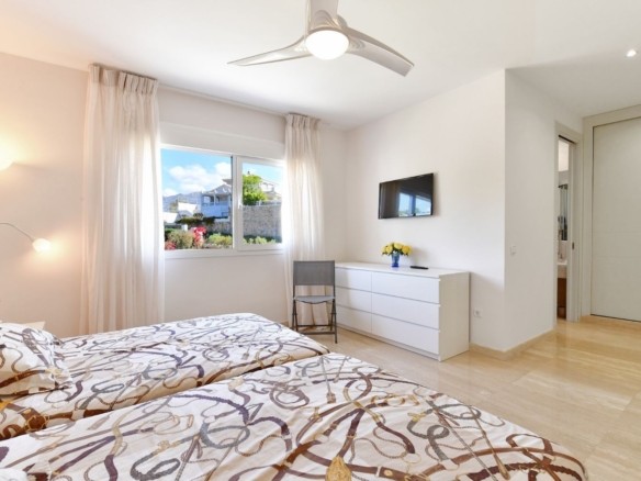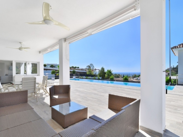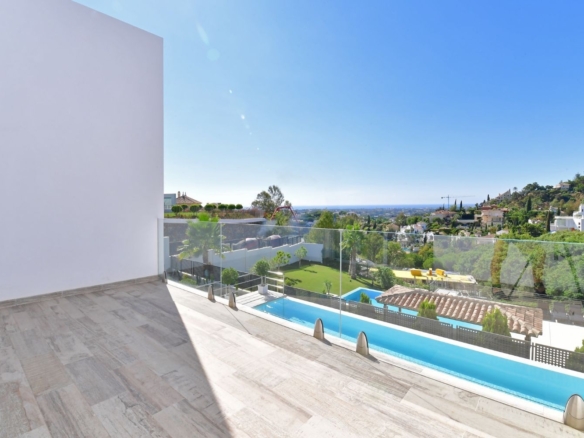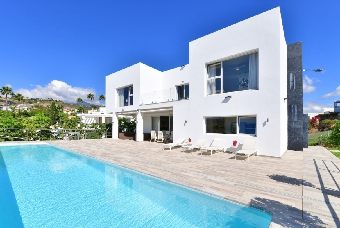 This recently built villa in La Quinta offers panoramic views over the valley towards the sea. The property of 4 bedrooms has 450m2 divided into ground, 1st floor and a basement. Both floors offers incredibles views, privacy, and generous terrace space surround the heated infinity pool. The basement holds a garage for 3 cars, two multi purpose rooms and a laundry room. Qualities and solutions are at a high level throughout the property, and the kitchen is German. Underfloor heating/cooling ensures a pleasant temperature all year round, and electric blinds provides shade for the sun. The villa is ready to move into, and in absolutely perfect condition.