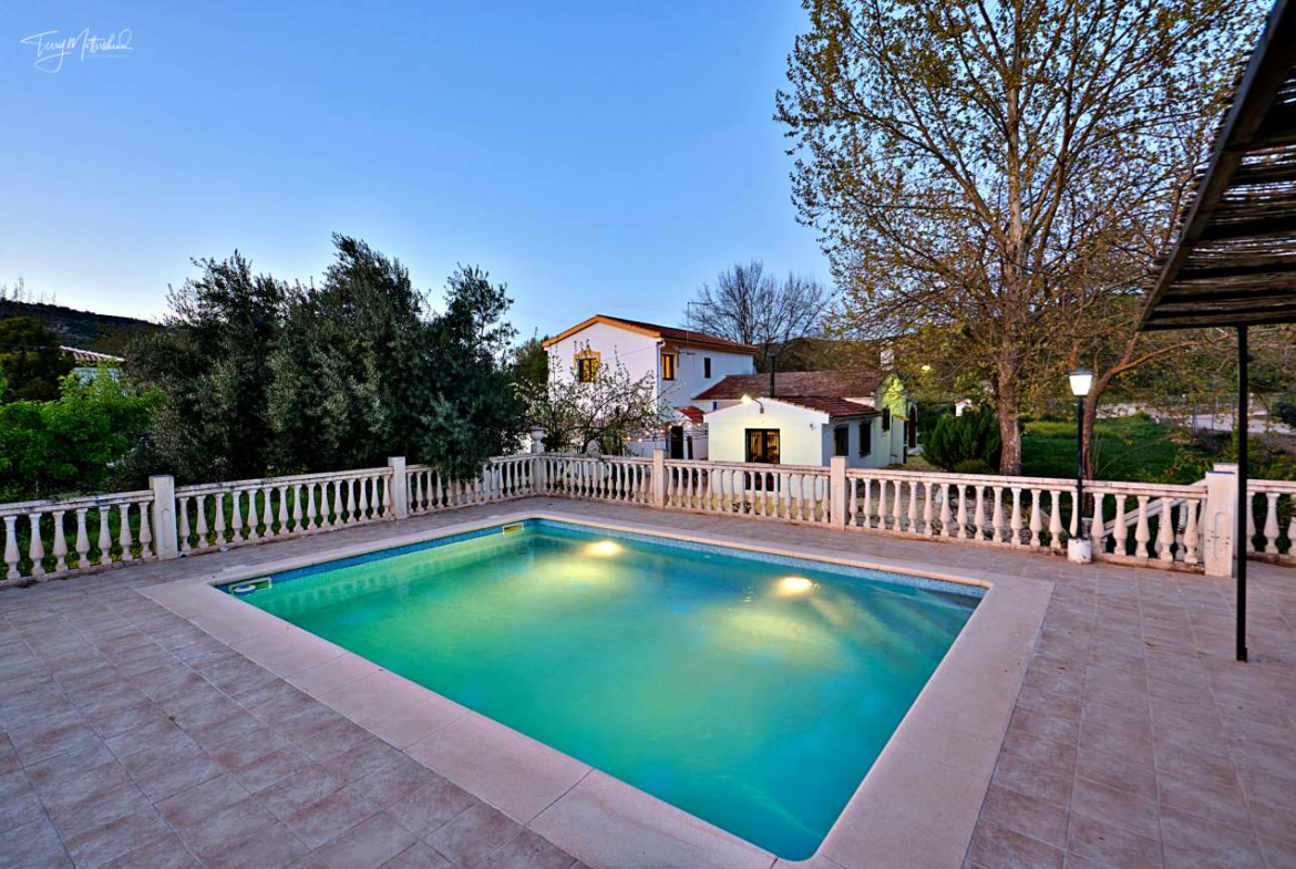This detached country villa is located just a five minute drive from the centre of the historic town of Montefrio. The property has a total of 637 m2 of build including the two storey main dwelling, the very large garage, separate workshop and raised, built pool terrace. This lovely country villa sits on a flat plot of 5892 m2 square which is fully fenced and has a gated driveway. The main plot of land at the rear of the property can be accessed by vehicle from the main driveway. The land has just a few olive and fruit trees but is mainly laid to grass and could be suitable for a horse, dogs or a large allotment/orchard.