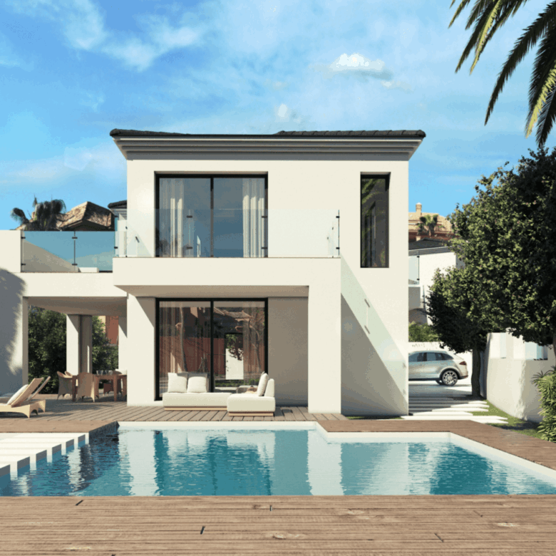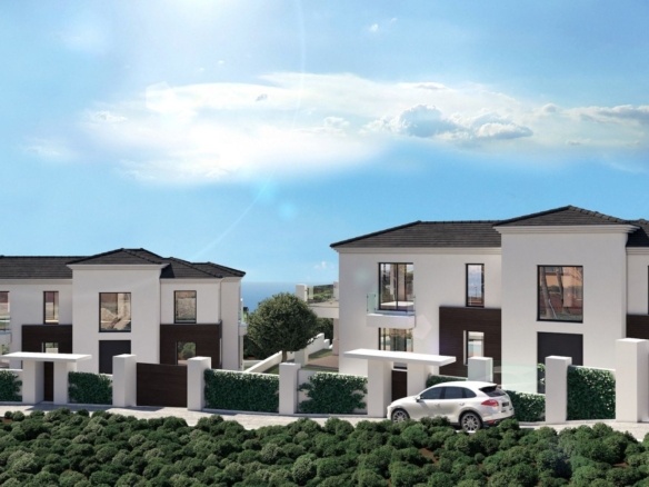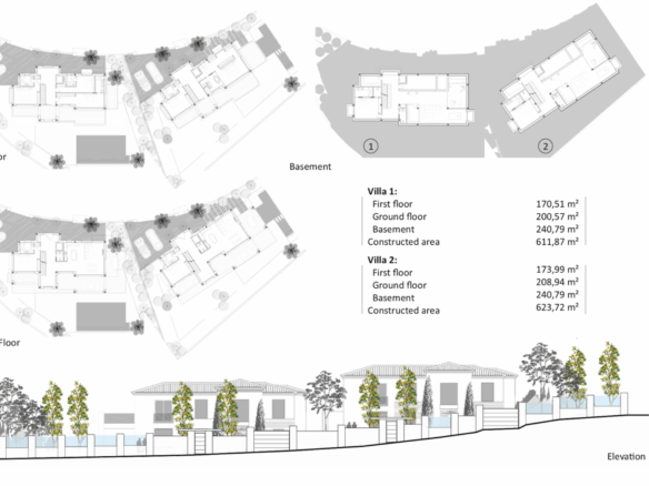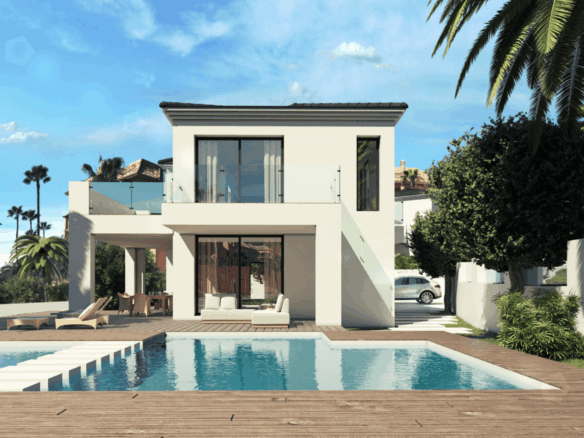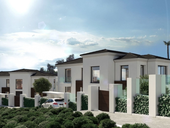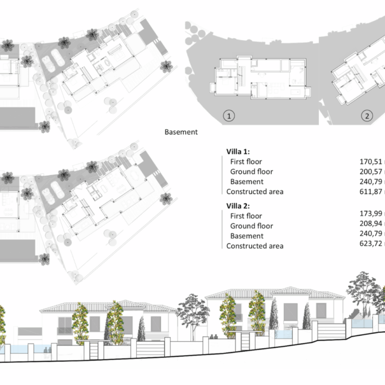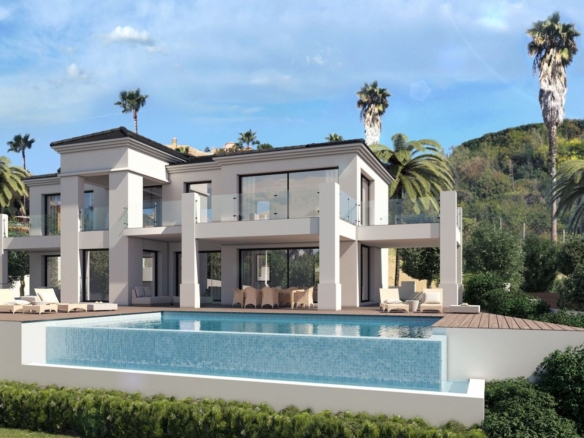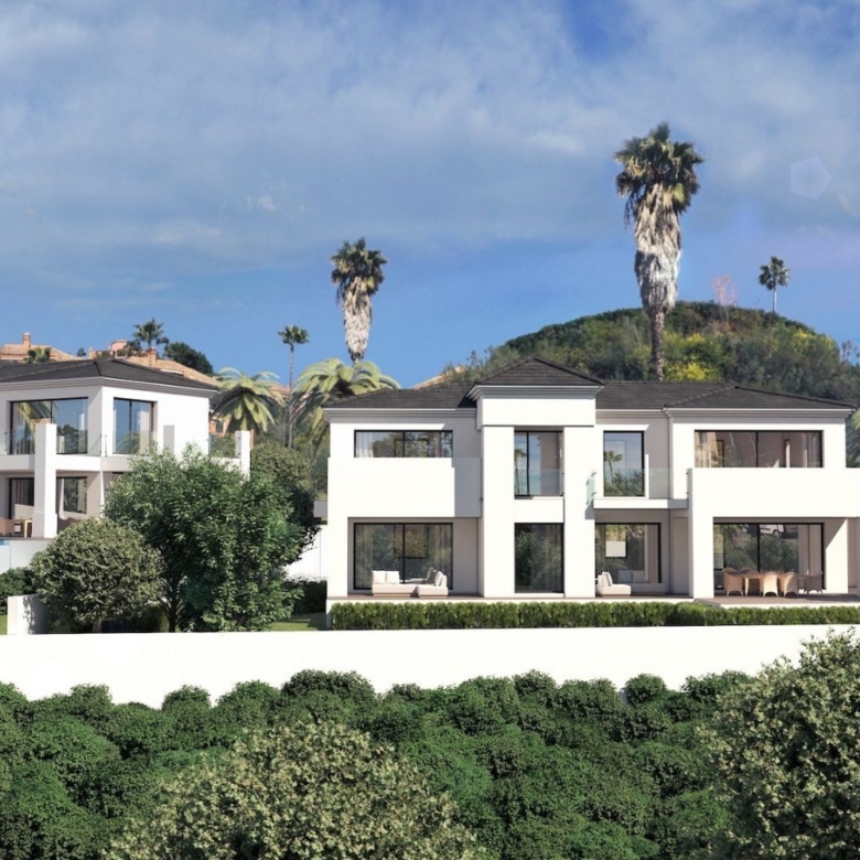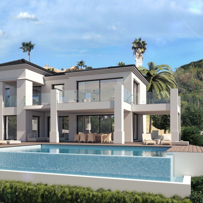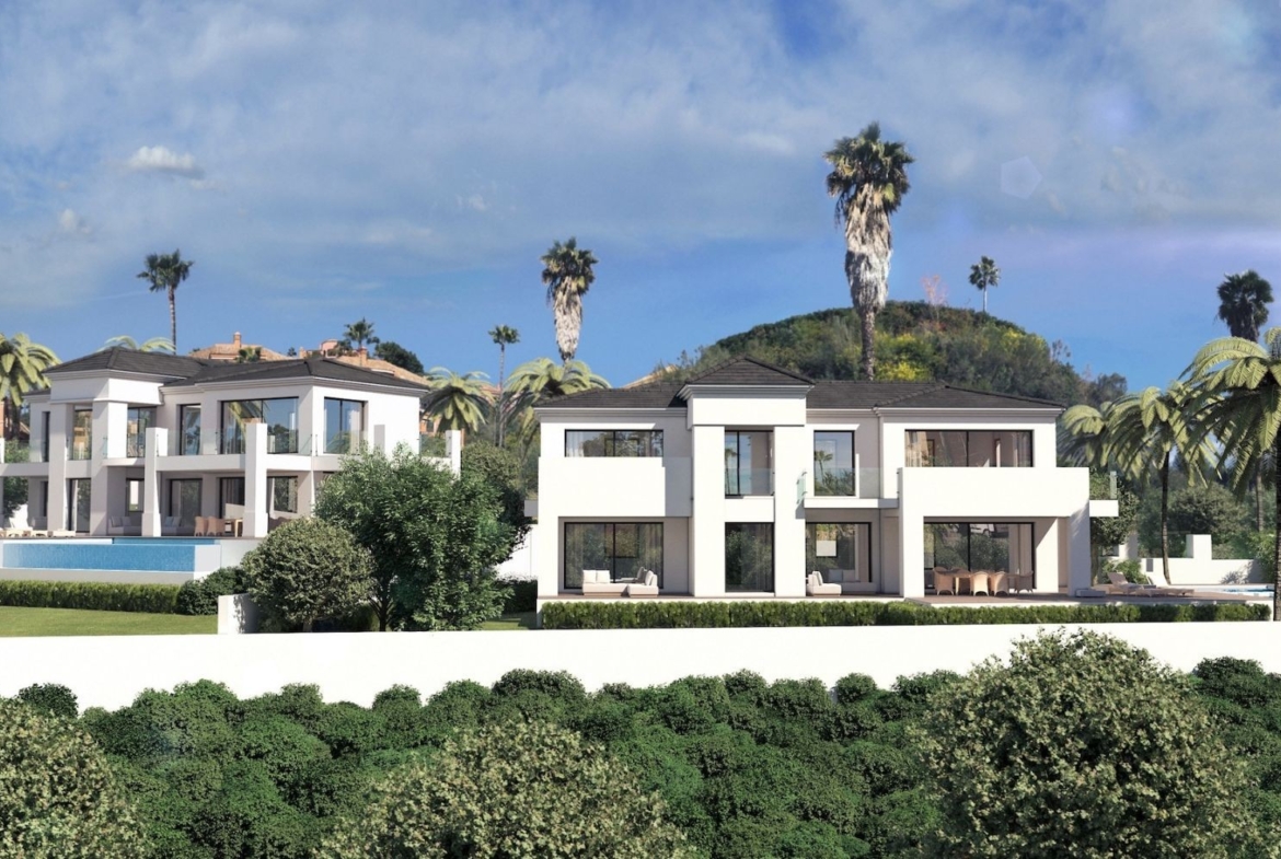 This unique new construction of two individual villas is located just a few minutes from San Pedro and Marbella at Monte Halcones residential area. Contemporary modern design and high quality materials and finishes are the principals of the project. Each villa is be situated within its own plot of over 1.000 m2 and has a built area of 612 m2. Positioned on a mountains slope, both villas offers panoramic views across Marbella, all the way to the Mediterranean coast. The first floors offers a master bedroom suite and two additional bedroom suites, and is accessible by stairs or lift. On the ground floor a large living area blends seamlessly with the kitchen, and access to the garden and terraces. The double parking garage is at ground level as well. Spacious terraces surround the villa, and provides the perfect amount of shade and sun. An infinity pool extends from the ground floor terrace, and can be ordered with both heating and pool cover. In the full height basement there is a gym, sauna, cinema, wine cellar and staff quarters. Both villas are completed in 2019, and key ready.