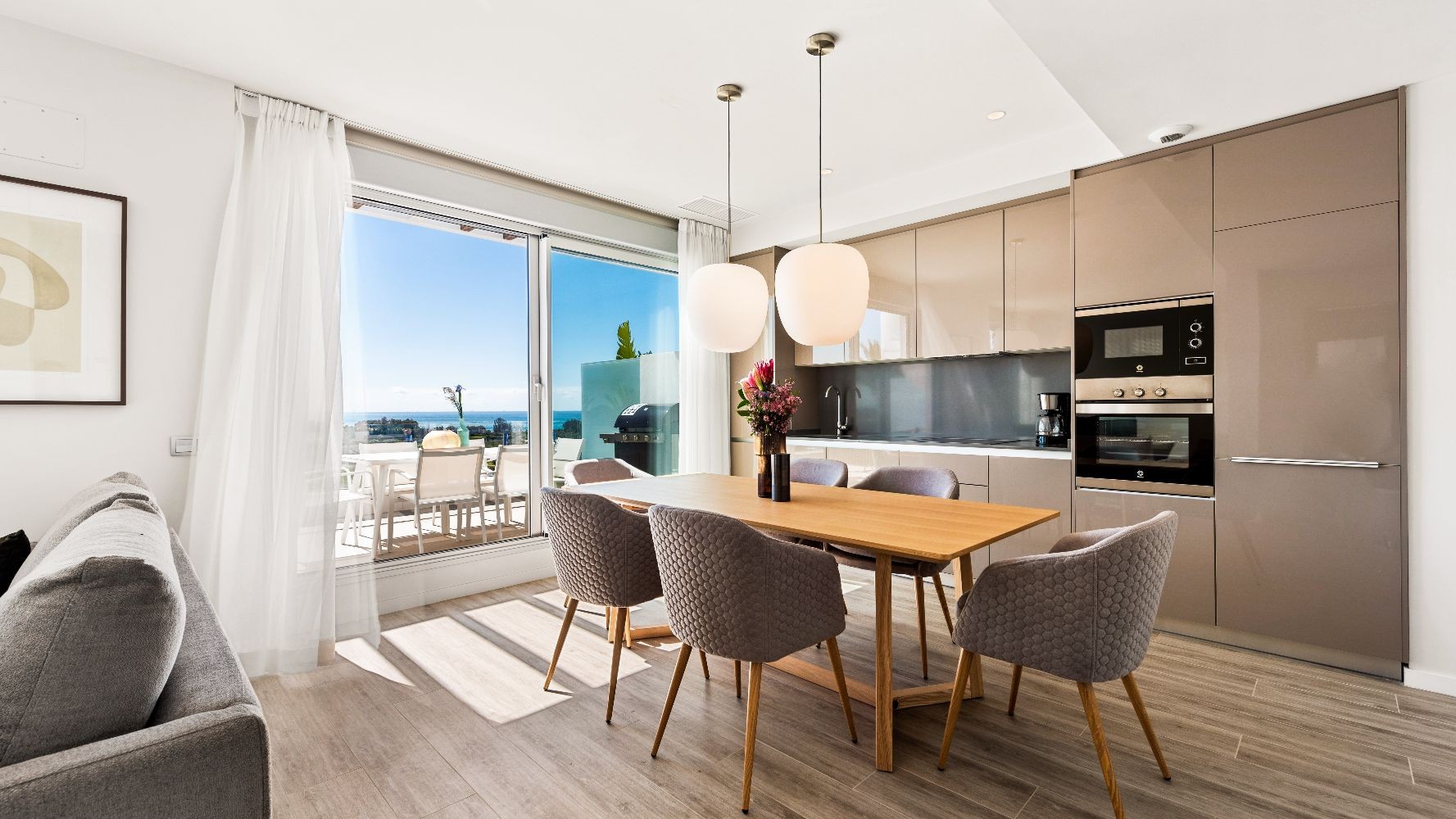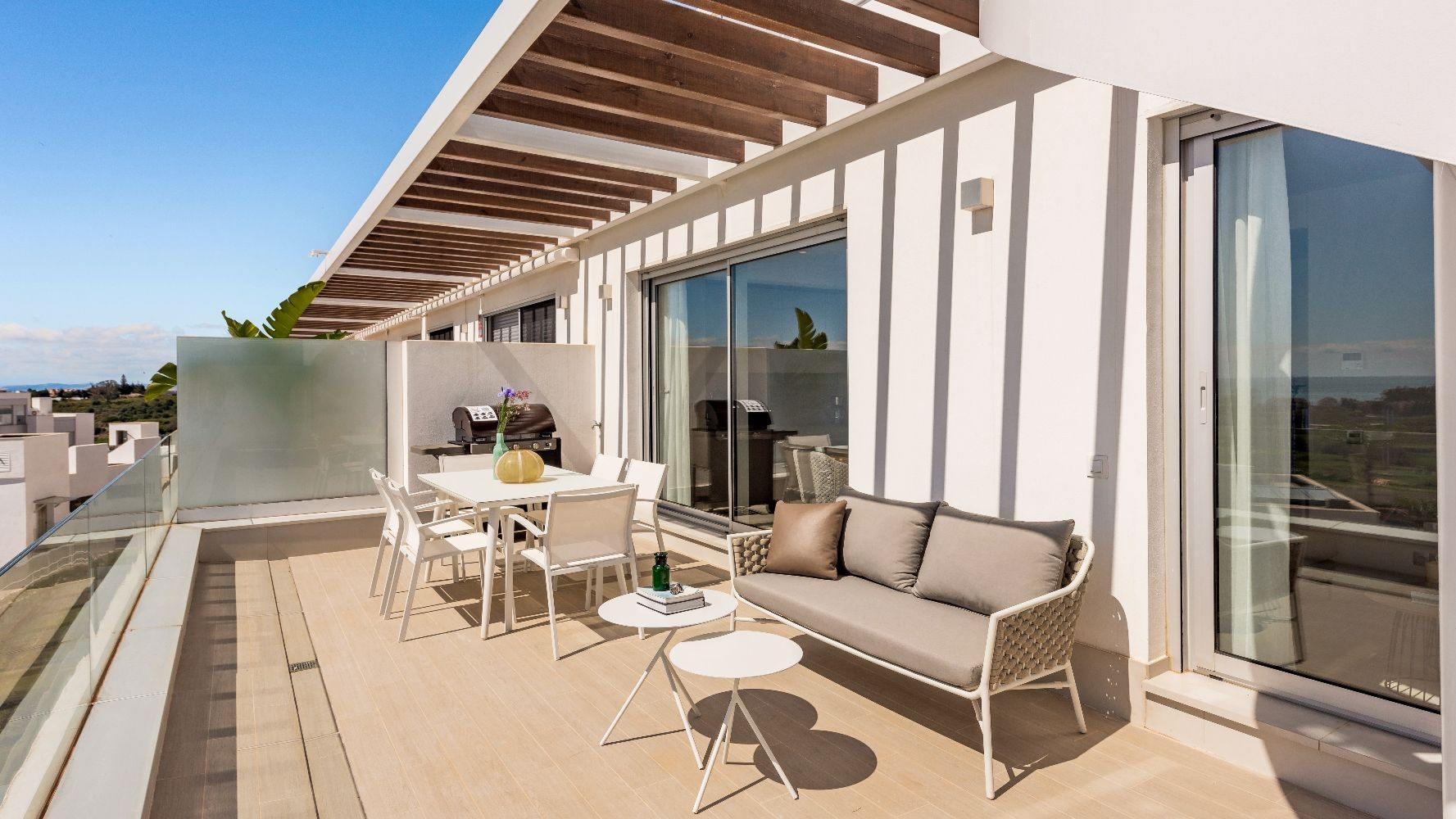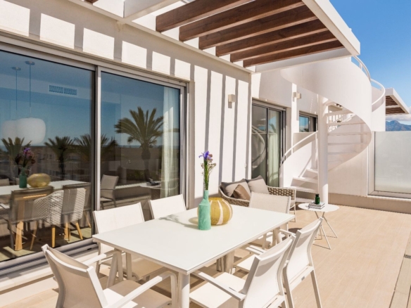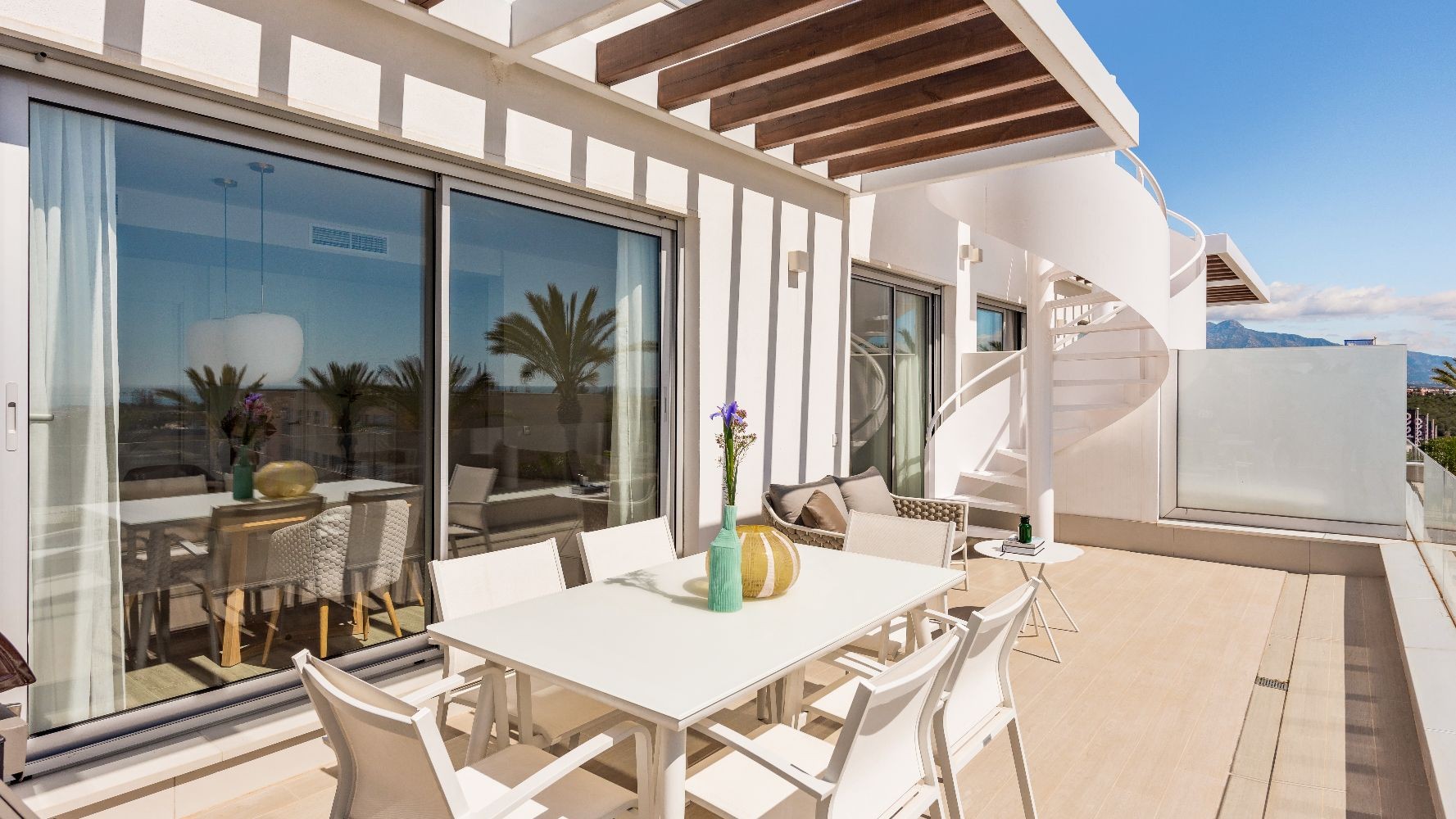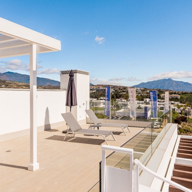 This 2 bedrooms duplex penthouse is located in the new Golden Mile, in Cancelada walking distance to amenities and services and just a few minutes driving from Hotel Anantara Villa Padierna, golf course los Flamingos, Saladillo Beach and Villacana. Contemporary design, comfort and quality combine all this with plenty of light and a unique living. Ground floor level have direct access to living area with open plan kitchen fully fitted and direct access to the terrace , two bedrooms with two bathrooms on suite, one of them with bath and the other one with walking shower, on the top floor there is a generous solarium with open views over the Mediterranean Sea. Porcelanic tiles, fitted kitchen with appliances, video porter, fitted wardrobes , double glazzing, shutters in windows, parking space and storage. This exclusive penthouse offer stunning views to the Mediterranean Sea and is surrounded by beautiful gardens and a beautiful pool. Residents gain access to the St. Vista Clubhouse and benefit from numerous leisure facilities and other amenities in the area.