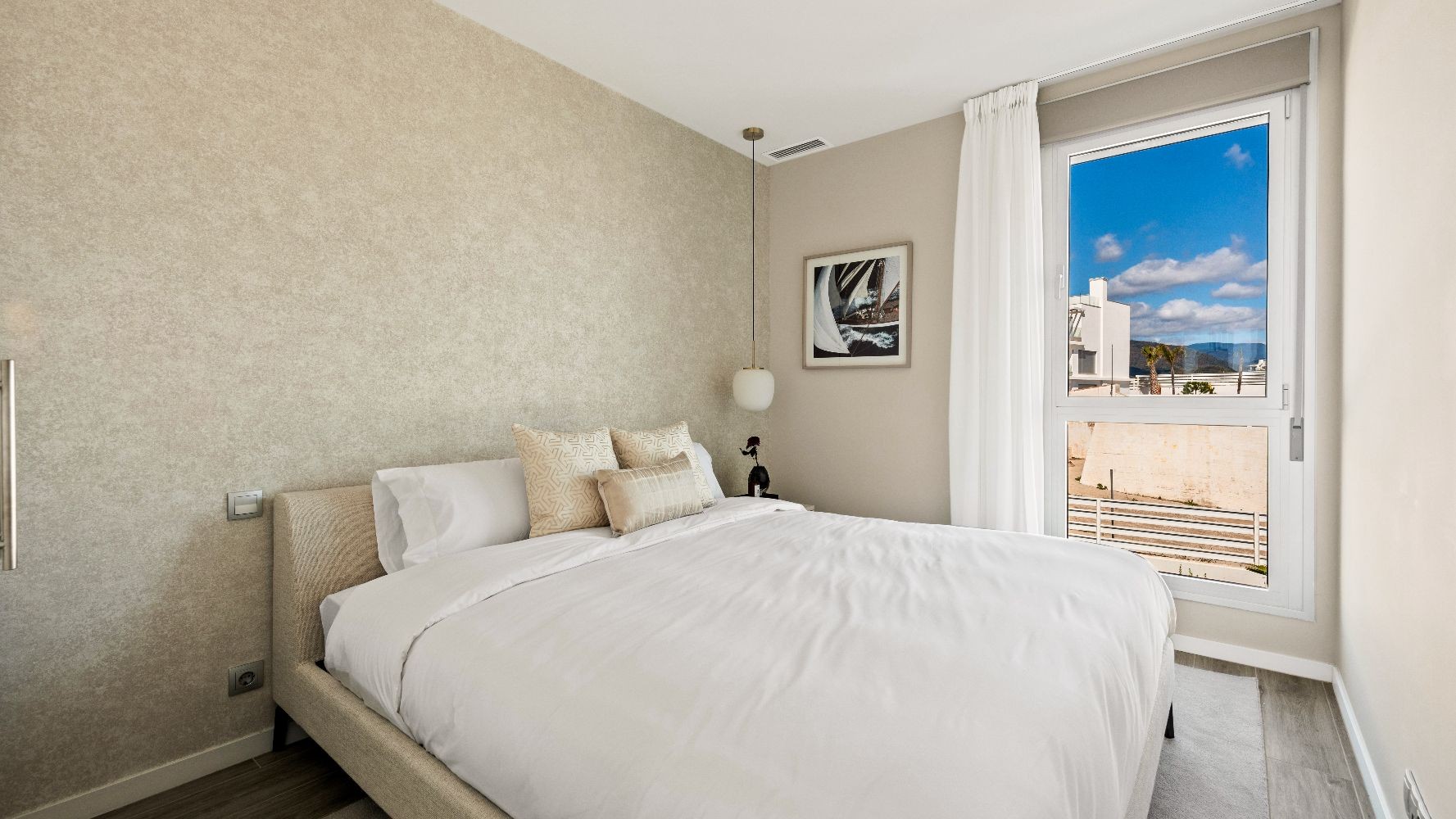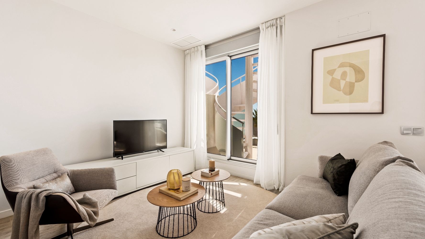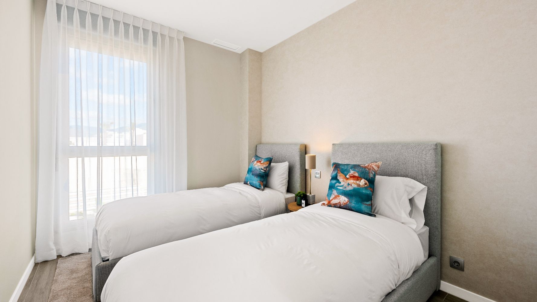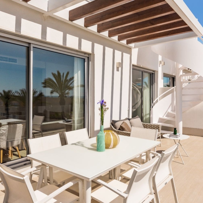 This 2 bedrooms duplex penthouse is located in the new Golden Mile, in Cancelada walking distance to amenities and services and just a few minutes driving from Hotel Anantara Villa Padierna, golf course los Flamingos, Saladillo Beach and Villacana. Contemporary design, comfort and quality combine all this with plenty of light and a unique living. Ground floor level have direct access to living area with open plan kitchen fully fitted and direct access to the terrace , two bedrooms with two bathrooms on suite, one of them with bath and the other one with walking shower, on the top floor there is a generous solarium with open views over the Mediterranean Sea. Porcelanic tiles, fitted kitchen with appliances, video porter, fitted wardrobes , double glazzing, shutters in windows, parking space and storage. This exclusive penthouse offer stunning views to the Mediterranean Sea and is surrounded by beautiful gardens and a beautiful pool. Residents gain access to the St. Vista Clubhouse and benefit from numerous leisure facilities and other amenities in the area.