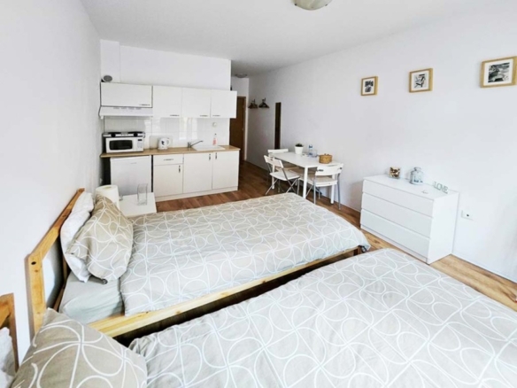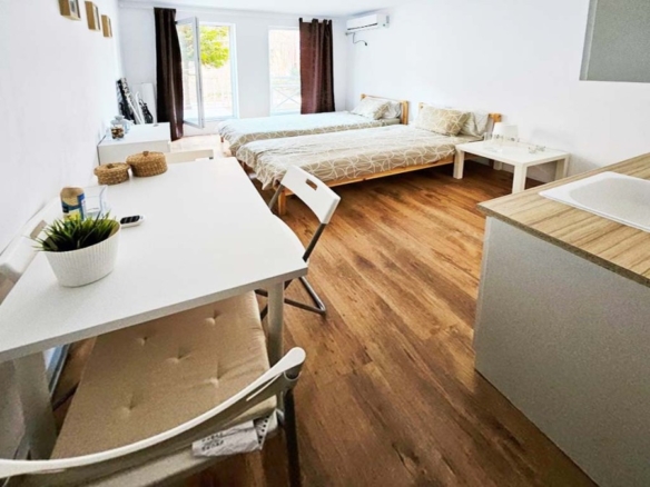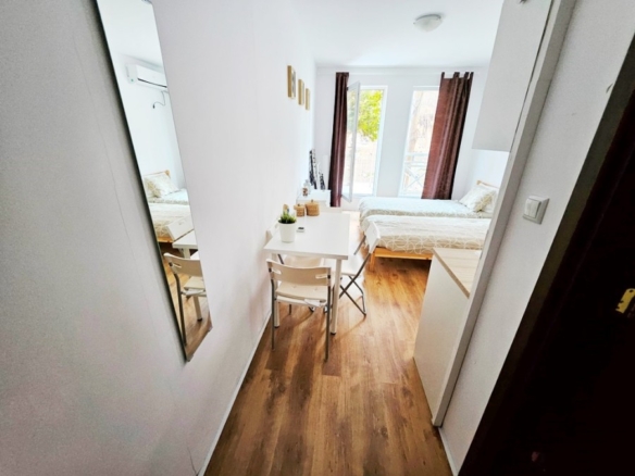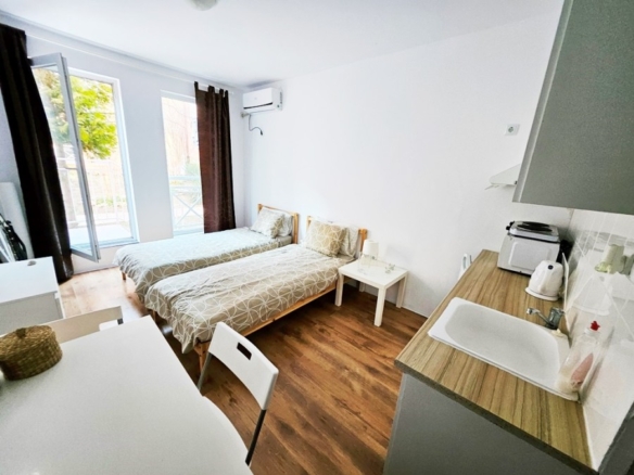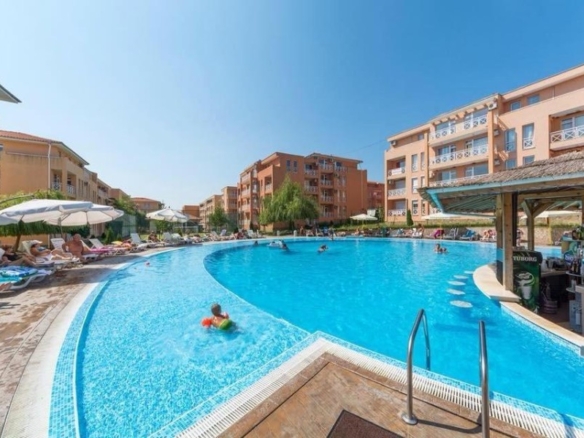 Nicely furnished studio, 25 sq.m., in Sunny Day 6, Sunny beach KC Properties is pleased to offer you this nicely furnished studio with aview to the gardens of the complex. The property is situated in Sunny Day 6 – a residential complex situated in the outskirts of Sunny beach resort, within 3 km to the sea coast. Nessebar town is 7 km away and Bourgas airport – 35 km away. On site facilities include: 5 outdoor pools, tennis-courts, mini-golf fields, outdoor sport facilities, restaurant, supermarket, free parking area, security, reception, regular shuttle service in the summer season. The apartment is situated on the ground floor and has a total area of 25 sq.m. It comprises of: – Open-plan kitchen with lounge area; – one bedroom; – Shower-room/toilet; No balcony. Direct access to the garden and pool. Act 16. Separate accounts for water and electricity. The apartment is offered fully furnished and is in excellent condition. It is perfect vacation home, ideal for families with children and people who would like to enjoy peacefulness. Pet friendly area. Annual maintenance fee -580 EUR/year.