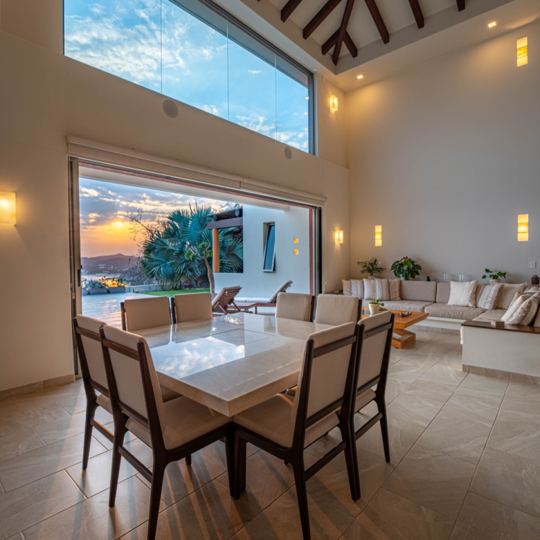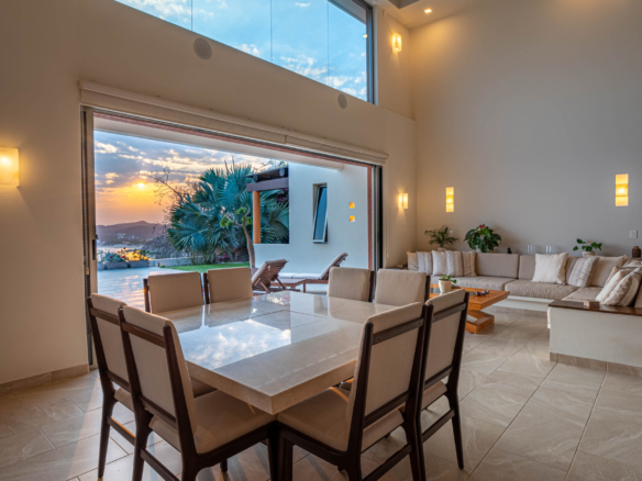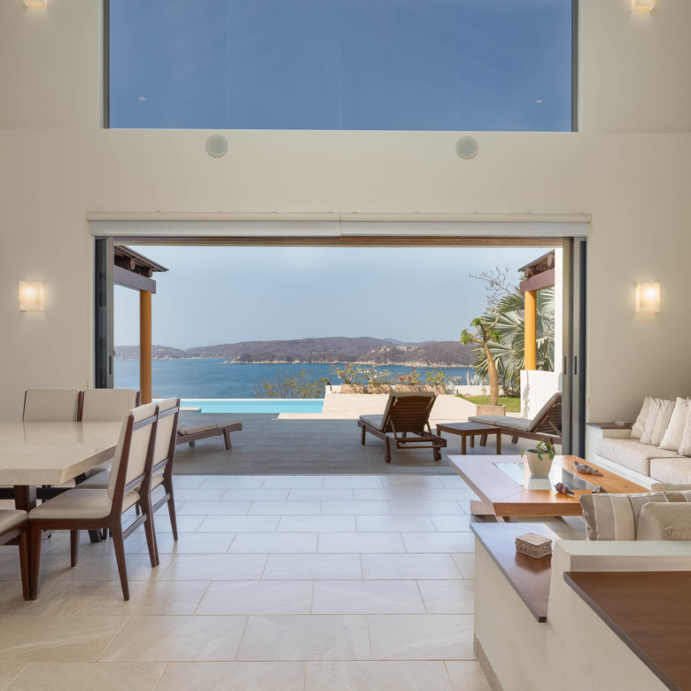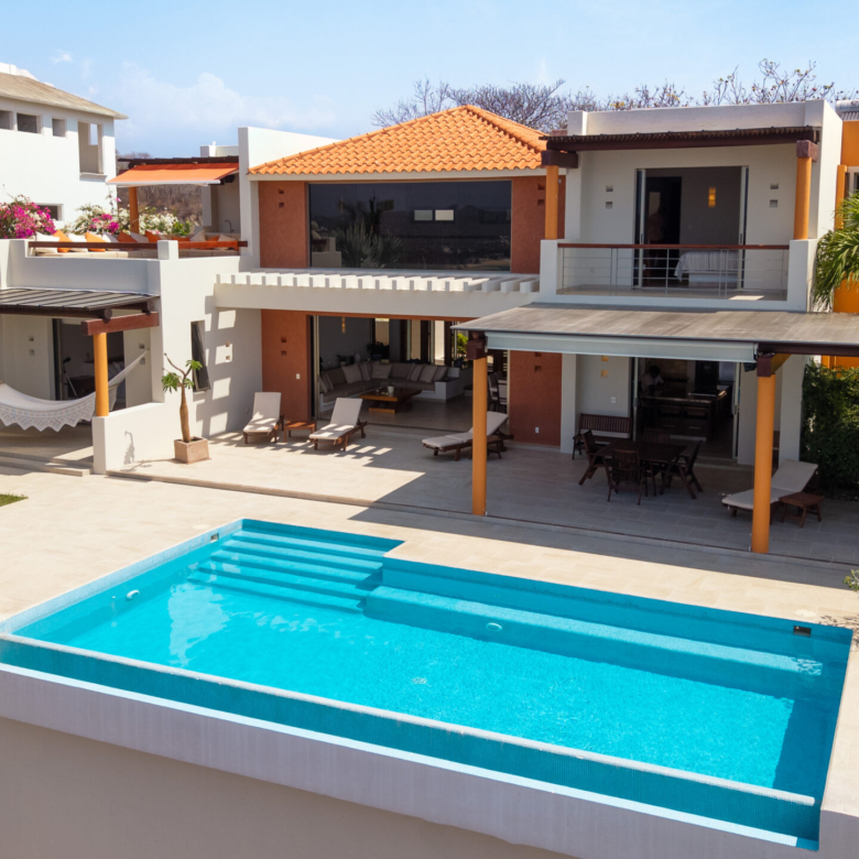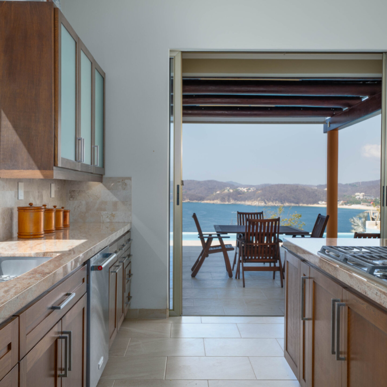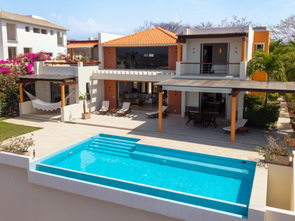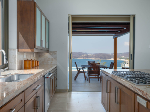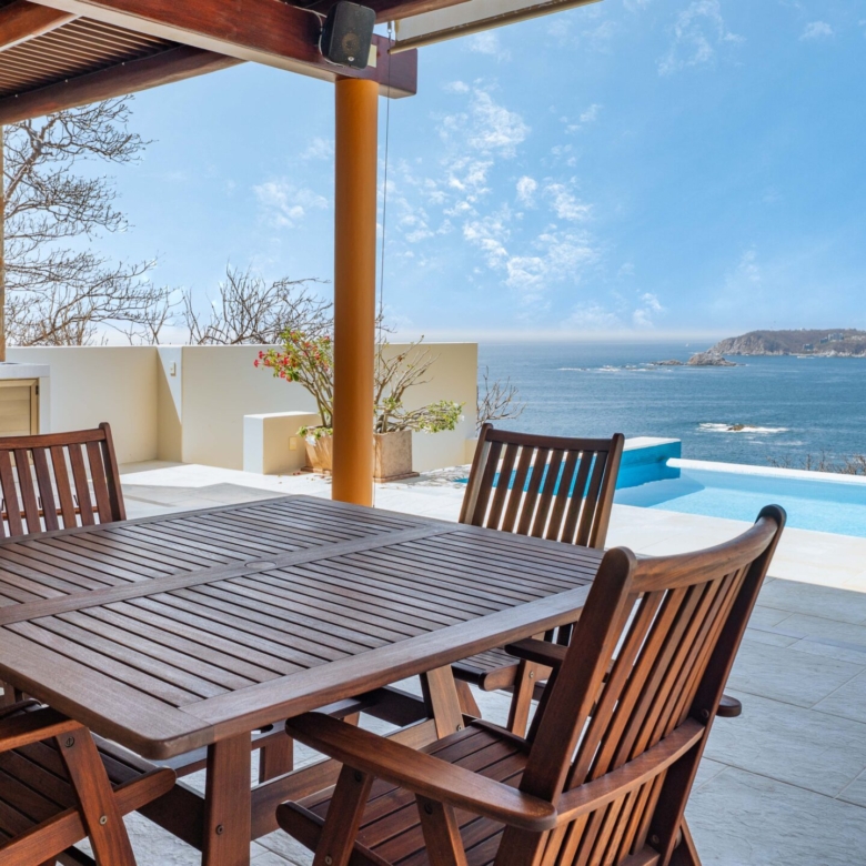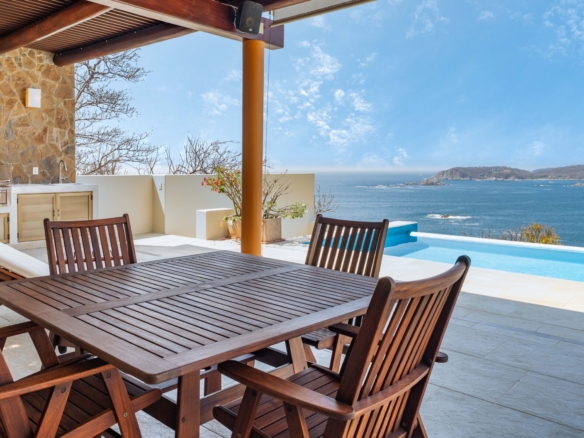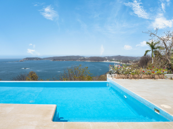 Perched on a stunning cliffside, this exquisite oceanfront villa in Mirador Chahué, Huatulco offers an unparalleled living experience, where panoramic ocean views and breathtaking sunsets create an atmosphere of pure tranquility. Designed for both comfort and elegance, the property includes three bedrooms, along with a studio and a TV room that can be easily converted into additional bedrooms—transforming the villa into a spacious five-bedroom retreat. With 4,305 Ft2 (400 M2) of living space on an 8,665 Ft2 (805 M2) lot, this residence beautifully merges luxury with the natural surroundings. Every detail of this home has been carefully designed to enhance comfort. Crosswinds and screen doors allow for natural ventilation, ensuring a fresh and breezy ambiance throughout. The saltwater pool invites you to unwind while overlooking the endless blue horizon. The exterior of the property is surrounded by lush green landscaping, creating a serene and private oasis. Outdoor and living room furniture are Sunbrella furniture. A water purification and softener system ensures the highest water quality throughout the home, while a solar water heater and 12 solar panels with 315 watts each add to its energy-efficient features. The house is also equipped with a voltage regulator and surge suppressor, offering protection and stability for all electrical systems. All bathrooms feature elegant marble countertops, adding a touch of luxury to every space. This property features two principal ensuite bedrooms, each designed as a private sanctuary with stunning, unobstructed ocean views. One is conveniently located on the main level, while the other sits on the second level, offering a unique perspective of the horizon. Wake up to the soothing sound of waves and unwind with breathtaking sunsets, all from the comfort of your own retreat. Security and convenience are paramount, with a camera surveillance system providing peace of mind and a sprinkler irrigation system maintaining the lush greenery that surrounds the property. High-speed fiber optic internet keeps you connected, whether for work or leisure. A built-in sound system extends throughout the kitchen, pool, and terrace, creating the perfect ambiance for entertaining or unwinding. The kitchen is a masterpiece of style and function, featuring spacious granite countertops, Macuil wood finishes, and top-tier appliances, including a wine cooler and Lynx stainless steel grill. A large granite island offers hidden storage for fresh vegetables and built-in cutting boards, while the walk-in pantry includes a vertical freezer for added convenience. The expansive countertops are completed by a Franke sink, ensuring durability and sophistication. Air conditioning keeps the space comfortable, and a sleek glass sliding door separates it from the living area—perfect for entertaining. A garbage disposal sink enhances efficiency for effortless daily tasks. Located in a quiet and exclusive setting with beaches just moments away, this property offers the perfect balance of privacy, natural beauty, and modern convenience. With parking for two vehicles, this exceptional villa is ready to welcome those seeking a refined coastal lifestyle. Don’t miss the opportunity to own this extraordinary oceanfront retreat. Contact us today to schedule a private viewing and experience coastal living at its finest.