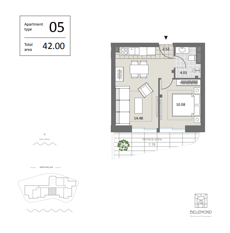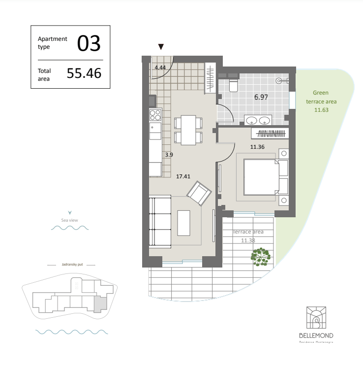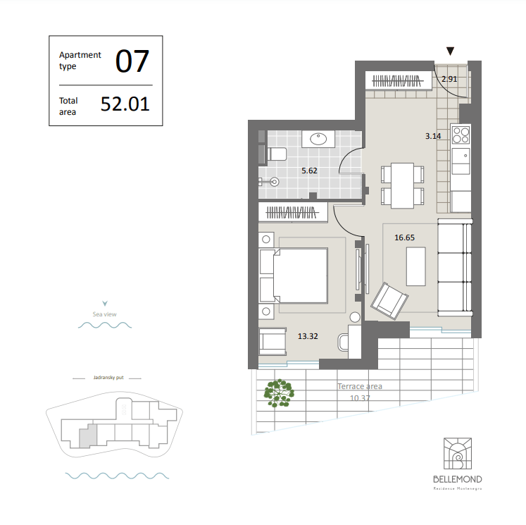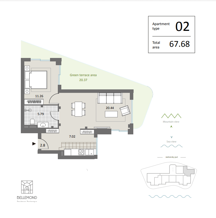 These luxury apartments are located in the heart of the Montenegro coast, in the Bellemond Residence complex, at Bečići beach, Budva. A two-kilometer-long footpath along the beautiful Adriatic Sea separates the Bellemond Residence Montenegro complex from the Old Town Budva (historical center), one of the most popular tourist destinations in the country.Bellemont Residence building has 10 floors, with green terraces, with sea and mountain views. They included concierge services 24/7; Wellness&SPA with gym, swimming pool, and sauna; Two-storey underground car parking and 2 passenger elevators; Children’s playground, sports park, and dog walking area; Private beach with reservations for residents of the complex and apartment rental company. Because of its excellent position, you can enjoy the sounds of the sea waves from the terraces, where the sunsets and sunrises create a fairy tale landscape every day.Different types and sizes of one-bedroom apartments are available:APARTMENT 102, first floor, 47m², PRICE €309.000APARTMENT 103, first floor, 55m², PRICE €324.000APARTMENT 202, second floor, 49m², PRICE €318.000APARTMENT 203, second floor, 57m², PRICE €335.000APARTMENT 303, third floor, 57m², PRICE €338.000APARTMENT 403, second floor, 57m², PRICE €344.000APARTMENT 502, fifth floor, 49m², PRICE €324.000APARTMENT 503, fifth floor, 57m², PRICE €344.000APARTMENT 601, sixth floor, 36m², PRICE €215.000APARTMENT 602, sixth floor, 49m², PRICE €334.000APARTMENT 603, sixth floor, 57m², PRICE €344.000APARTMENT 703, seventh floor, 55m², PRICE €349.000APARTMENT 801, eighth floor, 36m², PRICE €219.000High-quality materials are used for the interior design based on the project of the Pinar Ozcan Design Bureau. All apartments will be made on a turnkey system and fully furnished. There will be a possibility of furnishing based on the individual design.Settled in the nearby vicinity of all necessary amenities, only 150m from one of the most beautiful Montenegrin beaches, these apartments offer great rental potential and are an excellent investment opportunity. Bellemond Residence complex is very conveniently located in Bečići, within short driving distance to the most important locations and cities around: Budva Old Town 5km, Tivat airport 28km, Old Town Kotor 26 km, and Podgorica airport 58 km away.If you like these beautiful luxury apartments, contact us for more information.