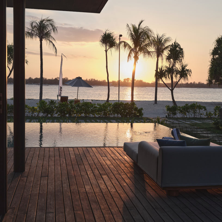 Don’t miss this rare opportunity to acquire a 1-bedroom beachfront pool villa in the prestigious BASK Gili Meno resort. All beachfront villas in this exclusive 5-star development were swiftly taken up, and were proud to offer this RESALE villa at an exceptionally attractive price. Positioned within a boutique collection of 83 luxurious villas, this property boasts double water frontage, offering stunning views of a serene saltwater lake and the sunset-facing beachfront.
