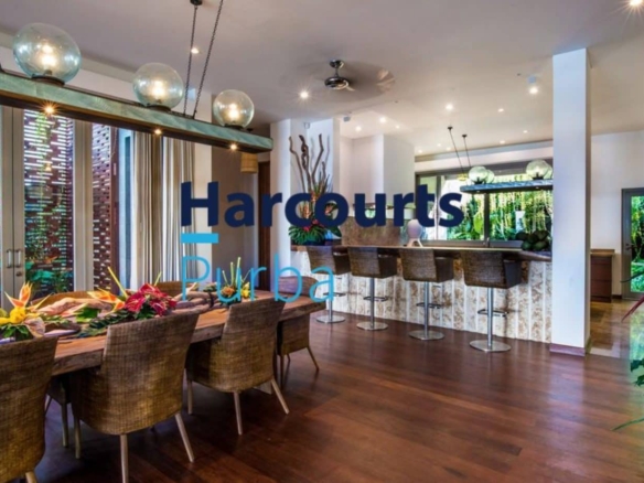 In-house dining options include a large bar overlooking the kitchen for more casual meals and entertaining, a large formal dining table , and a covered outdoor dining table, all having breathtaking ocean views.