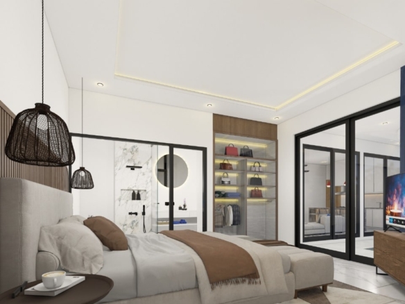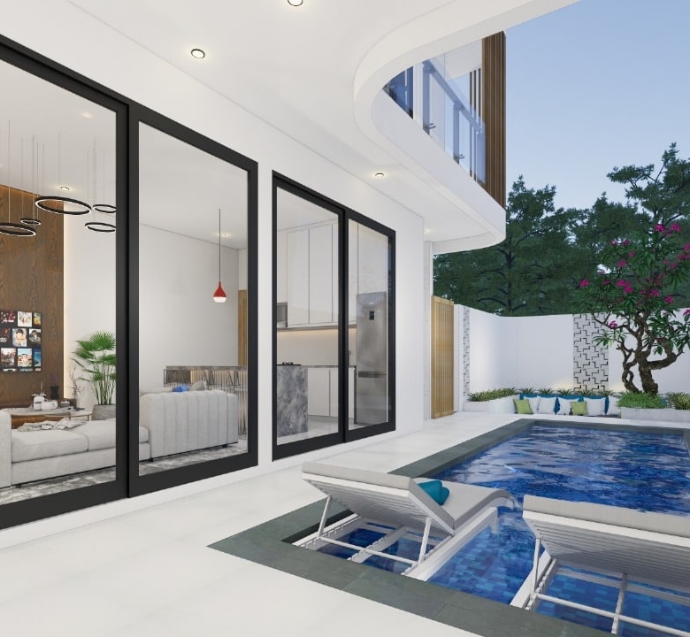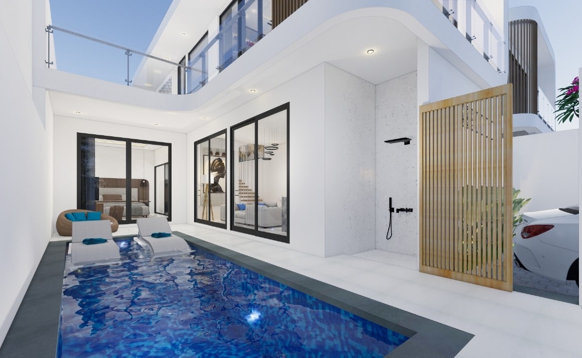 Sitting on 167 sqm of land with a generous 208.2 sqm of built space, the villa offers two stylish bedrooms, one on the ground floor opening directly to the pool, and one upstairs with its own lounge balcony and pool views. The enclosed living and dining area is paired with a sleek western kitchen, while floor-to-ceiling glass brings in natural light throughout. The villa features two bathrooms, a private pool, ground-floor poolside lounge, and parking for one car.