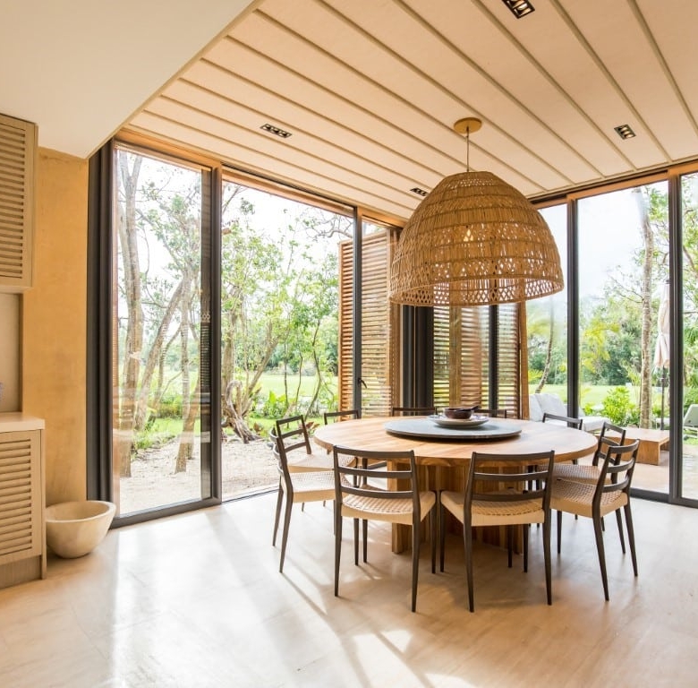 The villa’s outdoor living spaces provide over 1,839 square feet of serene relaxation, featuring a sunlit terrace and a sparkling swimming pool with stunning golf course views. Whether hosting intimate gatherings or savoring tranquil evenings beneath the stars, the outdoor retreat is designed for ultimate leisure.
