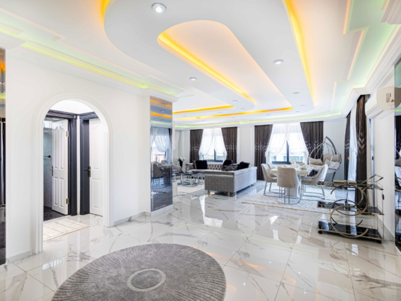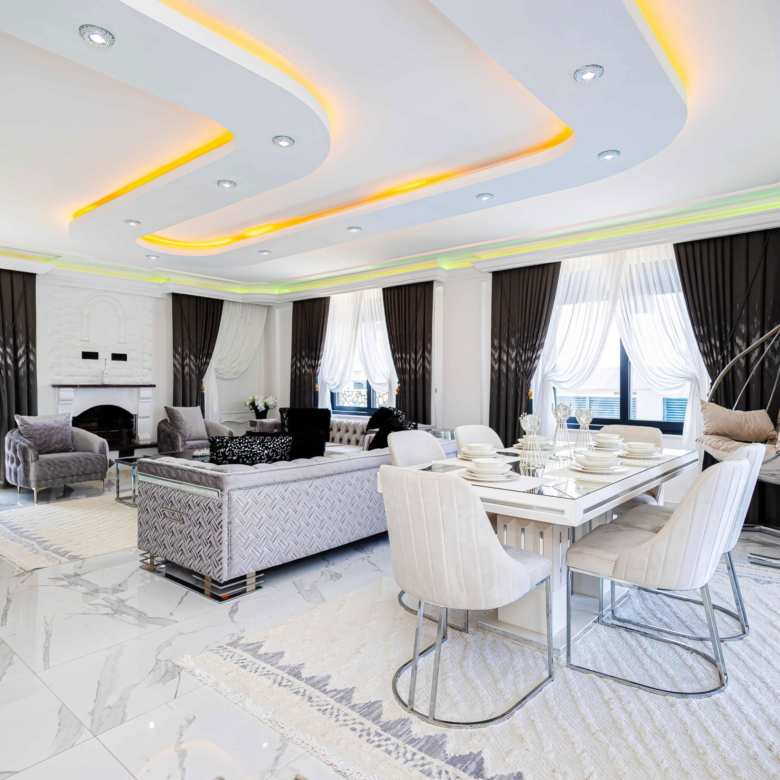 The expansiveliving roomincludes high-gloss marble-look floors, layered lighting from spotlights and LED strips, and a modern ceiling design. Furnished with contemporary sofas, a glass coffee table, and an elegant dining set, the space blends comfort and sophistication effortlessly.