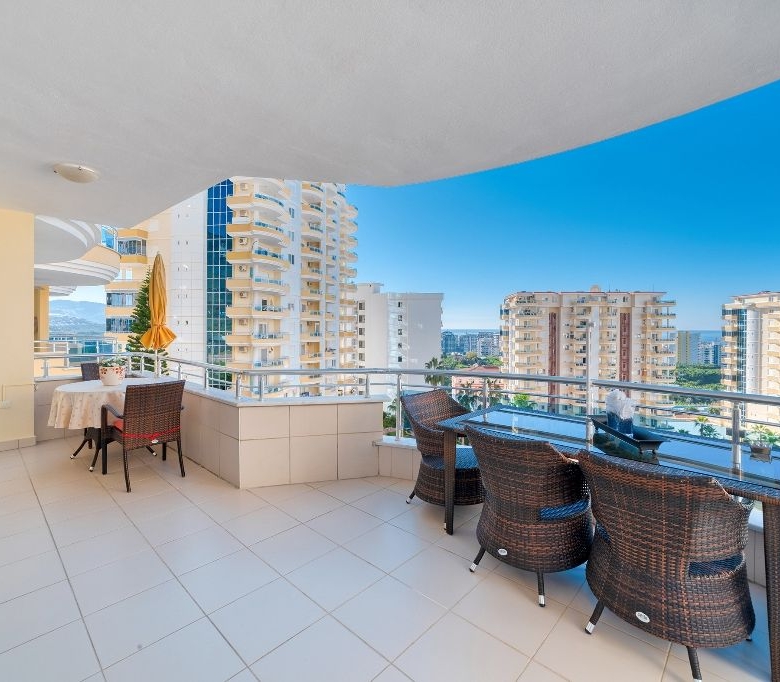 – Multiple rattan furniture sets on balconies for lounging and sunbathing.