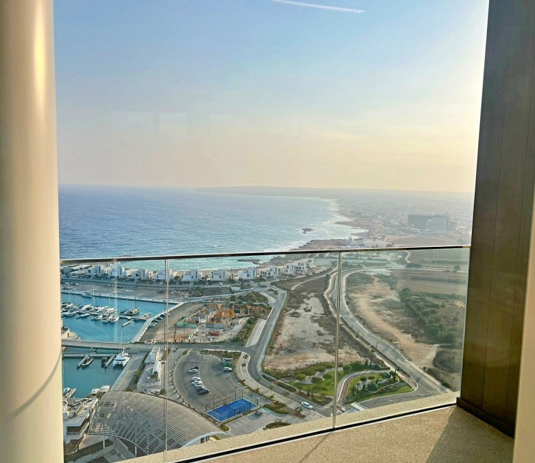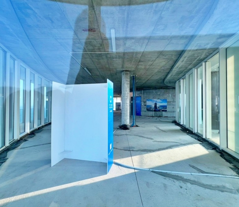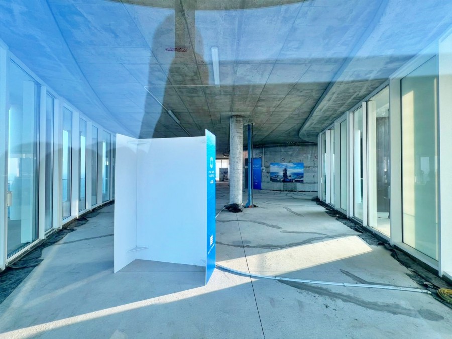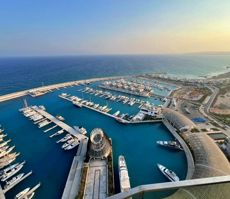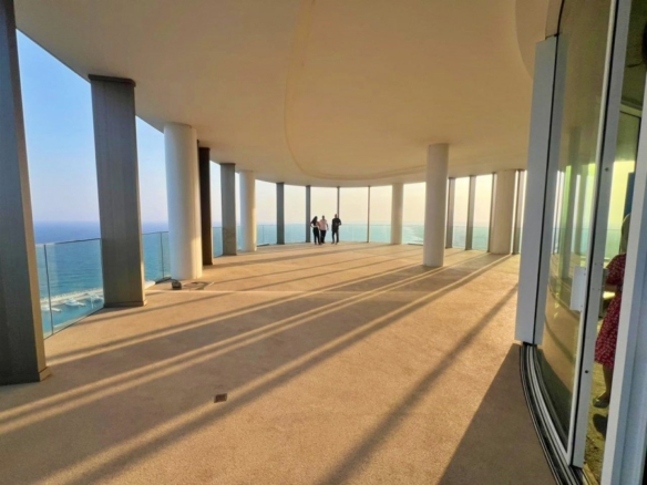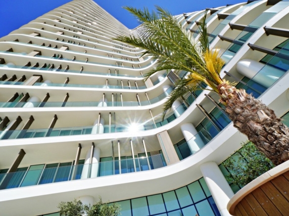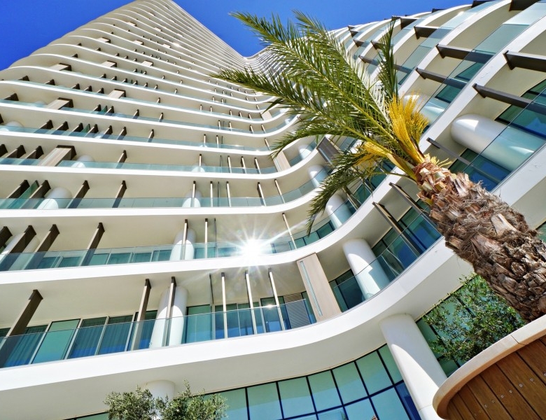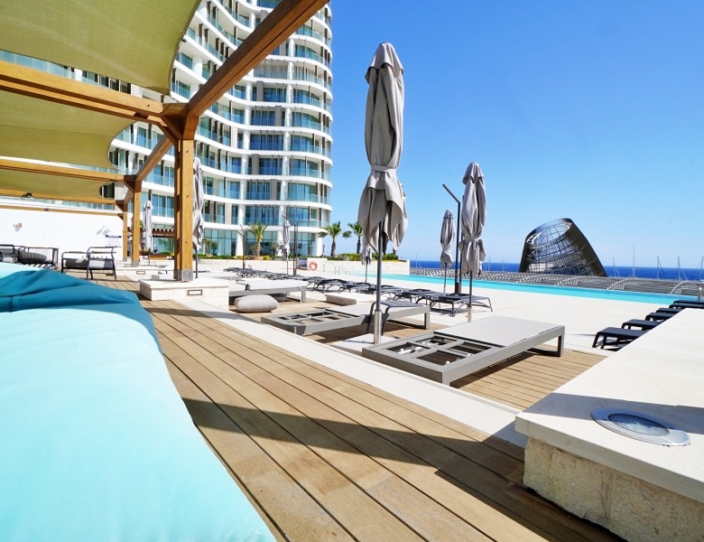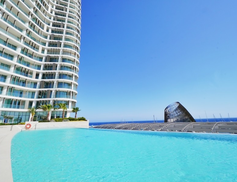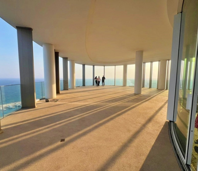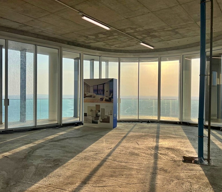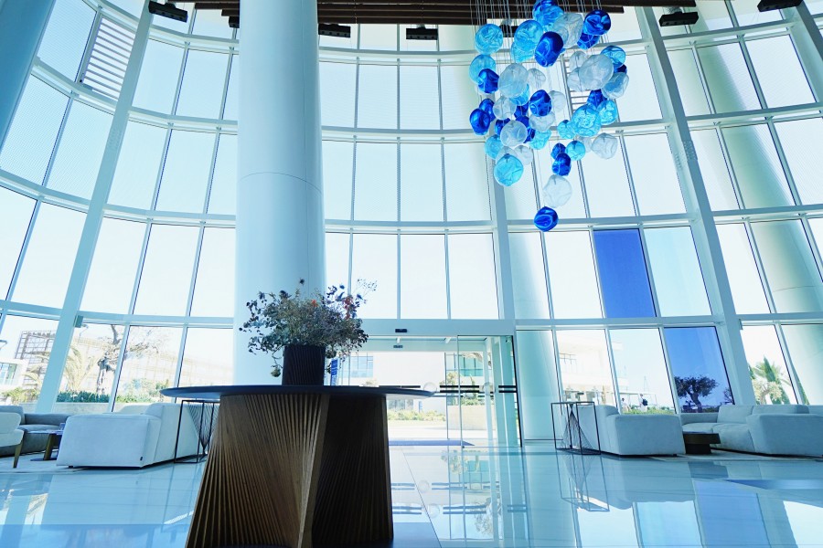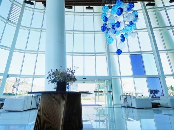 The East Tower is located at the commercial hub of the marina offering a vibrant and bustling environment for residents and guests. Its spacious lobby has an undulating sculptural ceiling soaring 12 meters above the floor and is surrounded by an all-glass exterior curtain wall with structural glass mullions. This allows an abundance of natural light to flow in and offers a direct view of the commercial area and Event Centre.