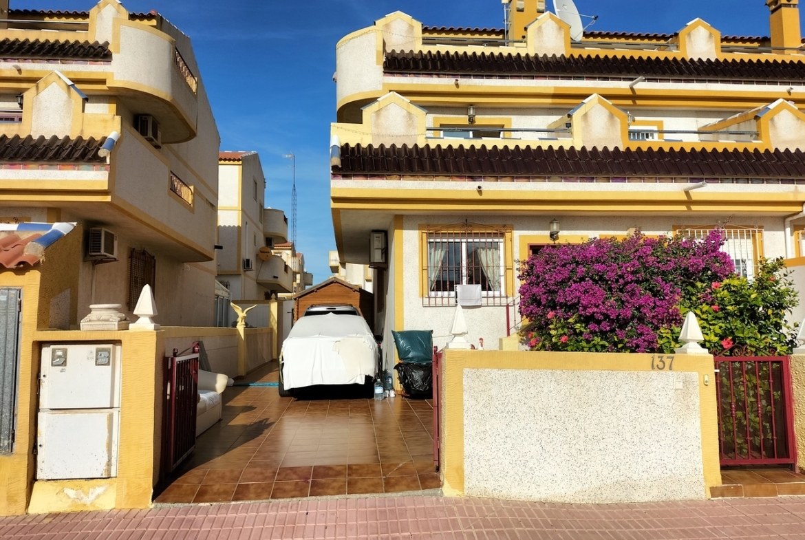 Beautiful sunny SOUTH facing CORNER townhouse in the lovely urbanisation of las chismosas. This 3 bedroom 3 bathroom corner townhouse boosts its 100m2 plot with plenty of outside space with off road parking for two cars. As you enter the property you have the front terrace. Entering the property we have a large living room with its fireplace , downstairs bathroom and kitchen which leads to the conservatory at the back of house. More outside space for dining plus laundry room with boiler washing machine etc. At the back there is also a large shed for more storage. As we make our way to the second floor there are 2 bedrooms and 1 bathroom with the main bedroom leading out to a large balcony area. Finally on the 3rd floor we have another bedroom and bathroom with outside terrace which has lovely views of the sea and surroundings. This property would make for a lovely home as its location is perfect just 2mins from restaurants and bars plus has its communal swimming pool and round the corner piscina bar with crazy golf and much more for the kids to enjoy. Situated just 5mins drive from the LA ZENIA BOULEVARD and loacal beaches it really makes for the perfect home