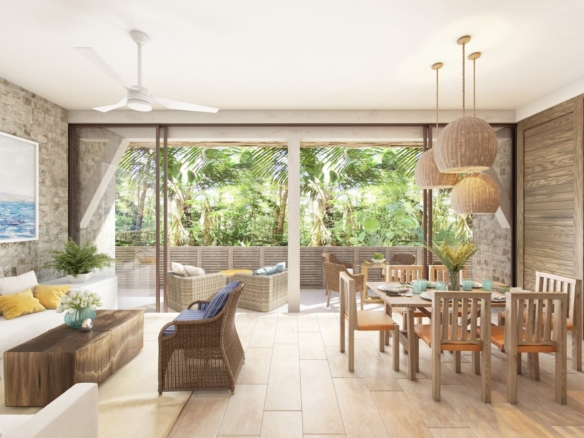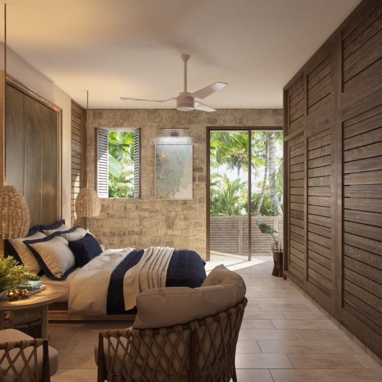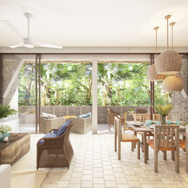 This thoughtfully designed two-bedroom unit features a spacious layout that maximizes indoor-outdoor living. A generous terrace opens to your own private pool, surrounded by native greenery that enhances privacy and tranquility. Floor-to-ceiling windows bring in natural light while framing views of the surrounding jungle.