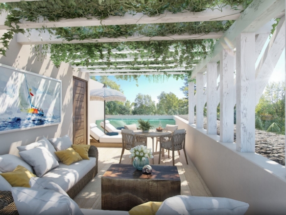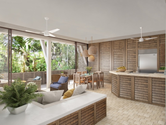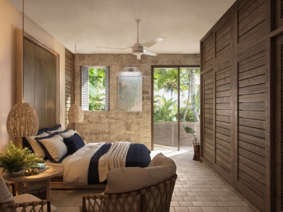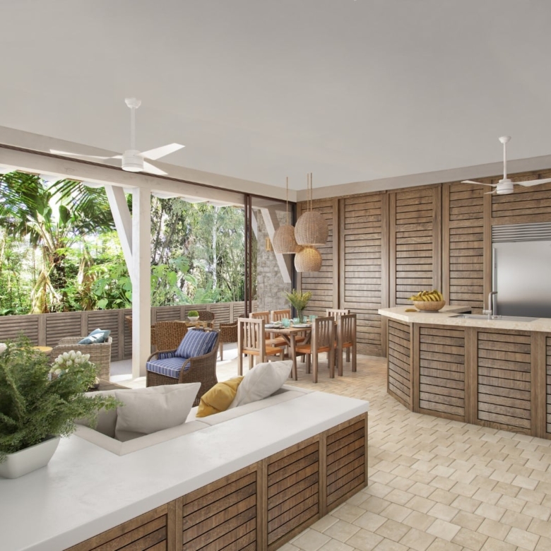 The interiors reflect a timeless aesthetic with earthy tones, clean lines, and locally inspired textures. A well-appointed kitchen flows into an open living and dining space, creating a calm and cohesive environment. The two bedrooms are situated to provide comfort and privacy, each with easy access to spa-inspired bathrooms finished with artisanal details.