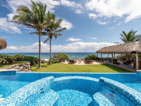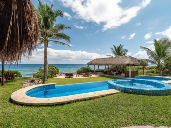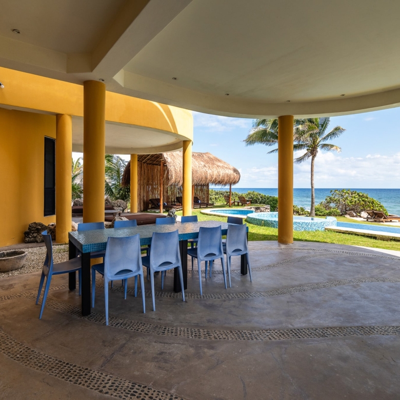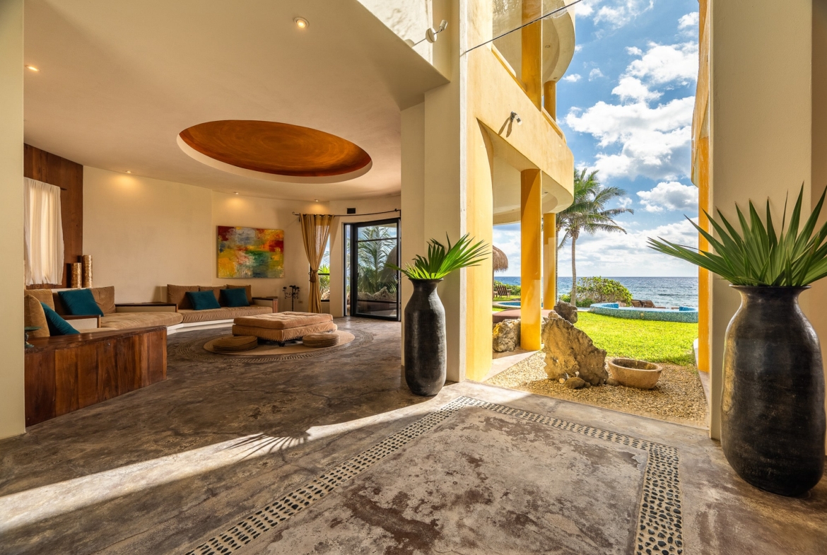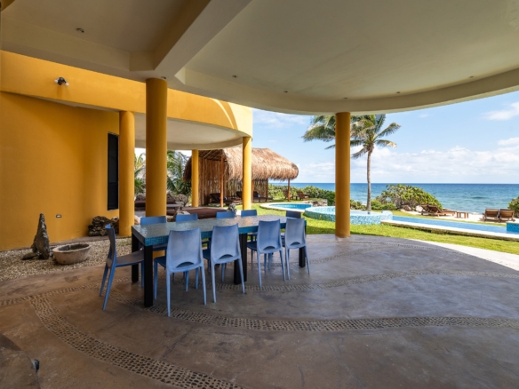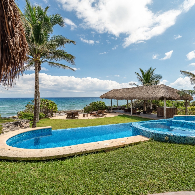 Punta Sur 5 is a premier beachfront villa in Akumal, offering a private retreat with breathtaking Caribbean views and sophisticated design. Situated on a 1,400 m² (15,064 ft²) lot, this expansive 1,187 m² (12,768 ft²) villa is a showcase of luxury, seamlessly blending contemporary architecture with the natural beauty of Punta Sur.