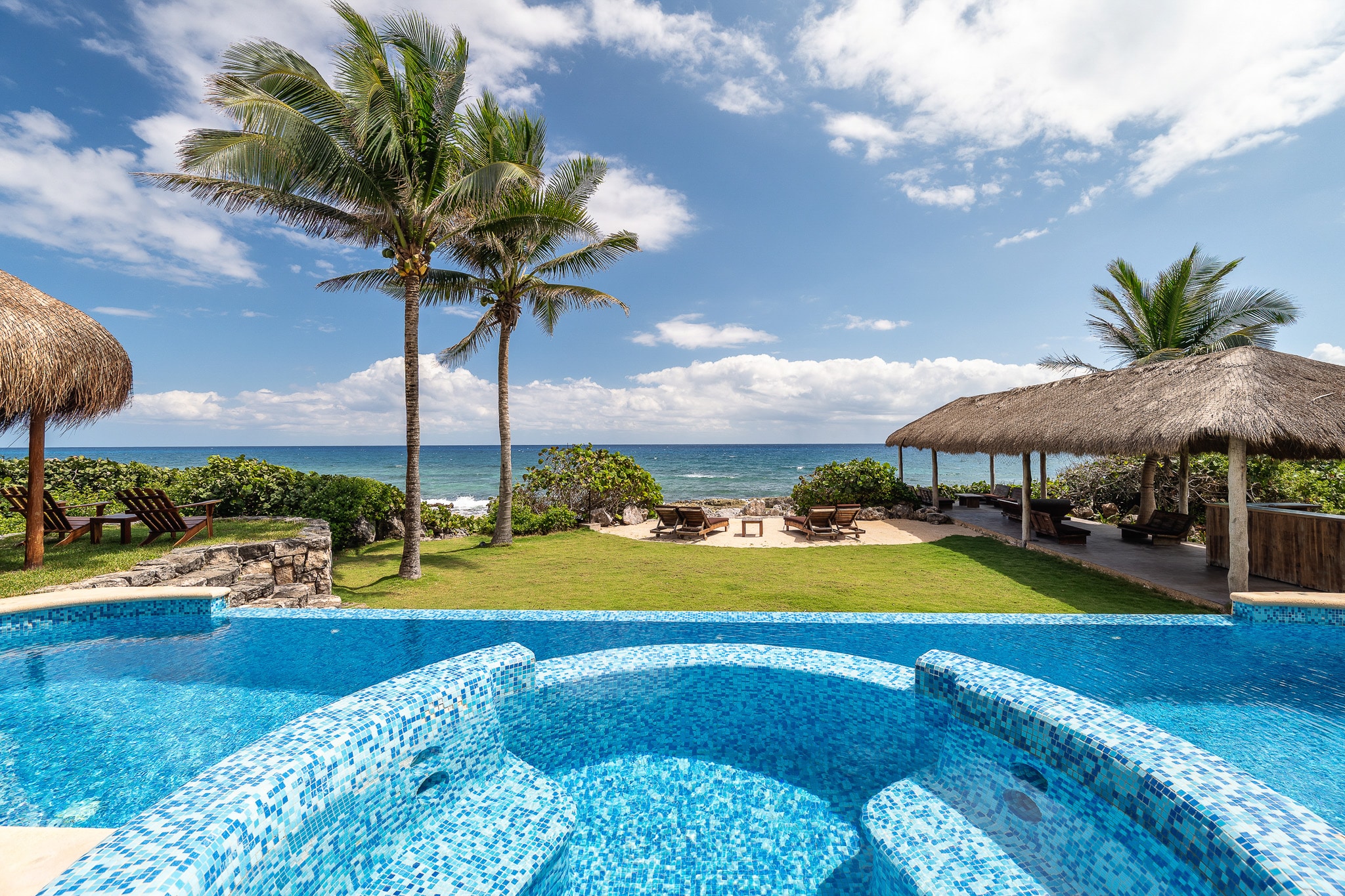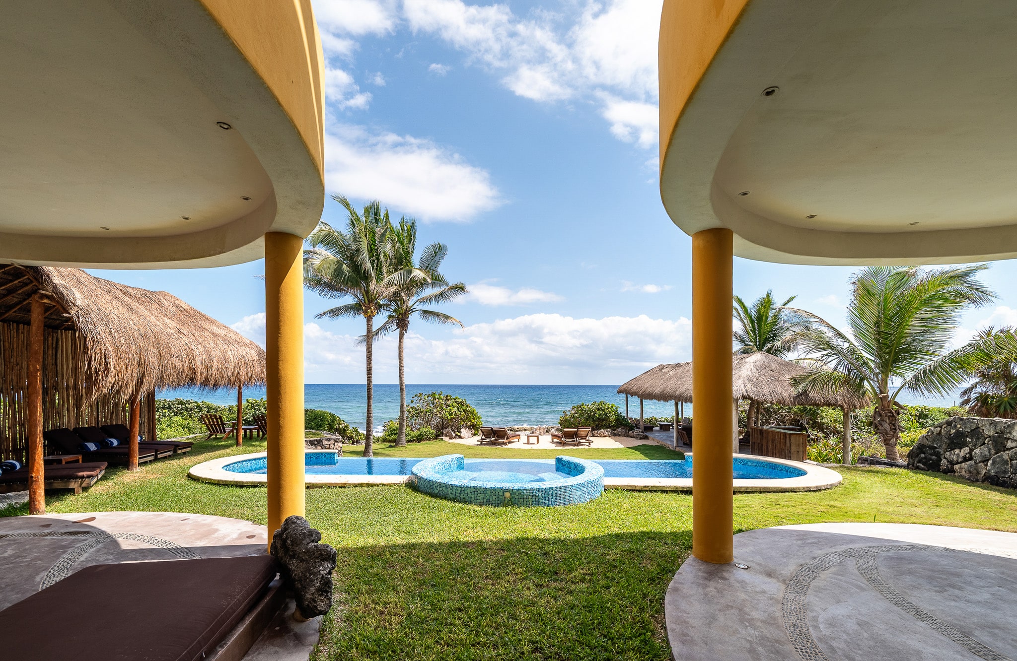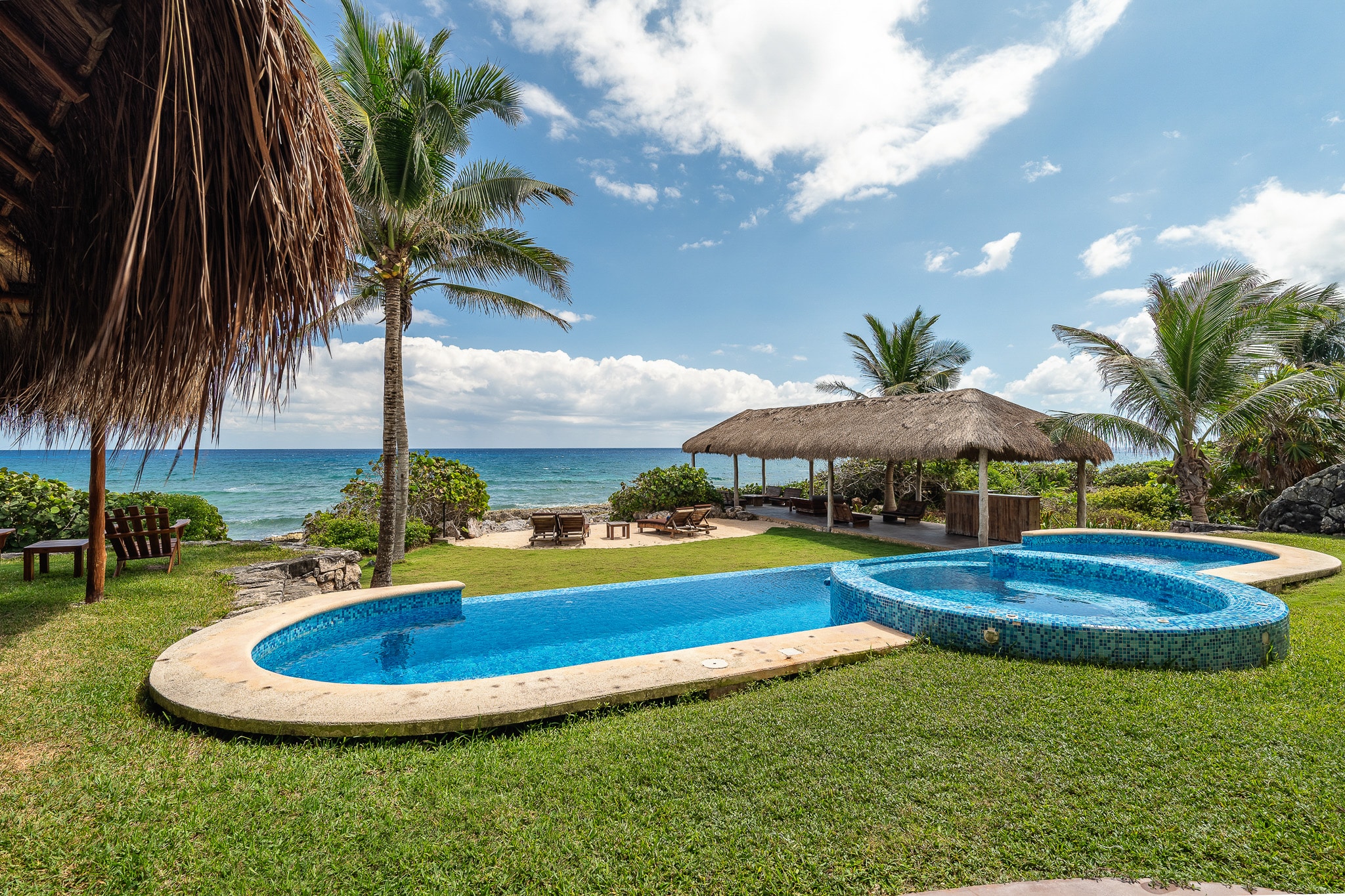 Punta Sur 5 is a premier beachfront villa in Akumal, offering a private retreat with breathtaking Caribbean views and sophisticated design. Situated on a 1,400 m² (15,064 ft²) lot, this expansive 1,187 m² (12,768 ft²) villa is a showcase of luxury, seamlessly blending contemporary architecture with the natural beauty of Punta Sur.