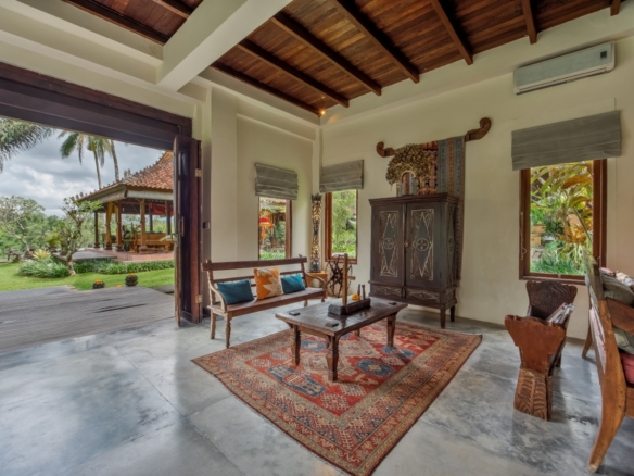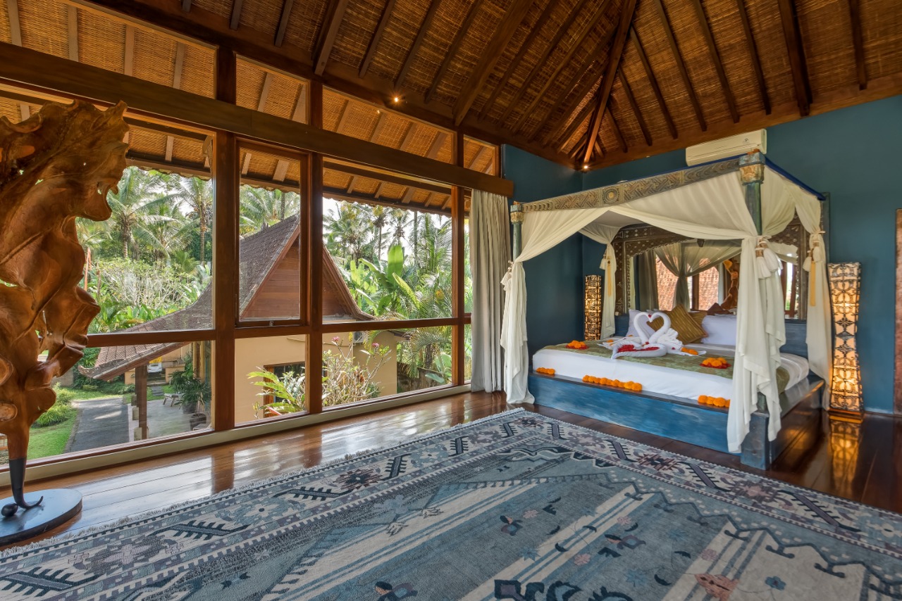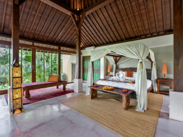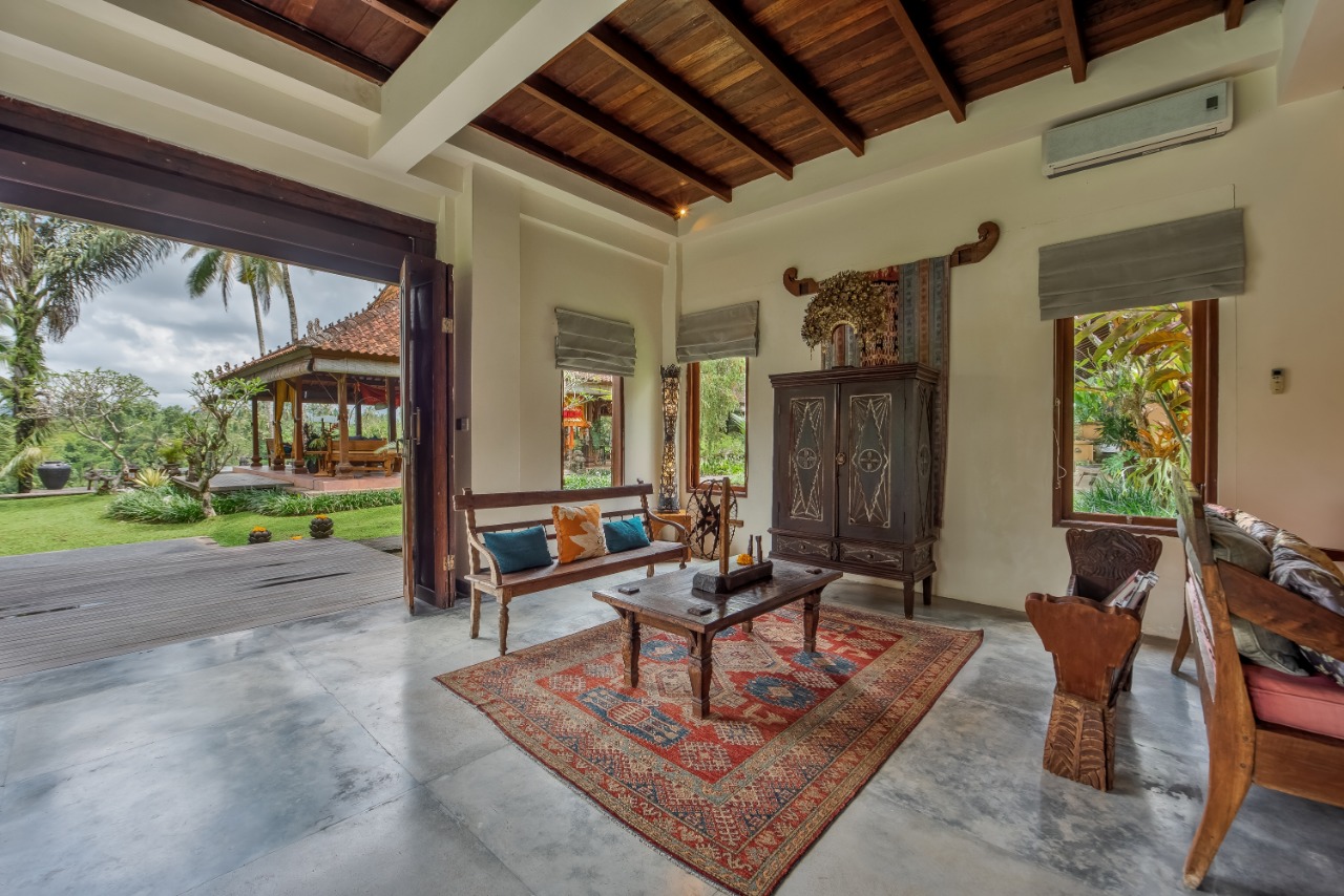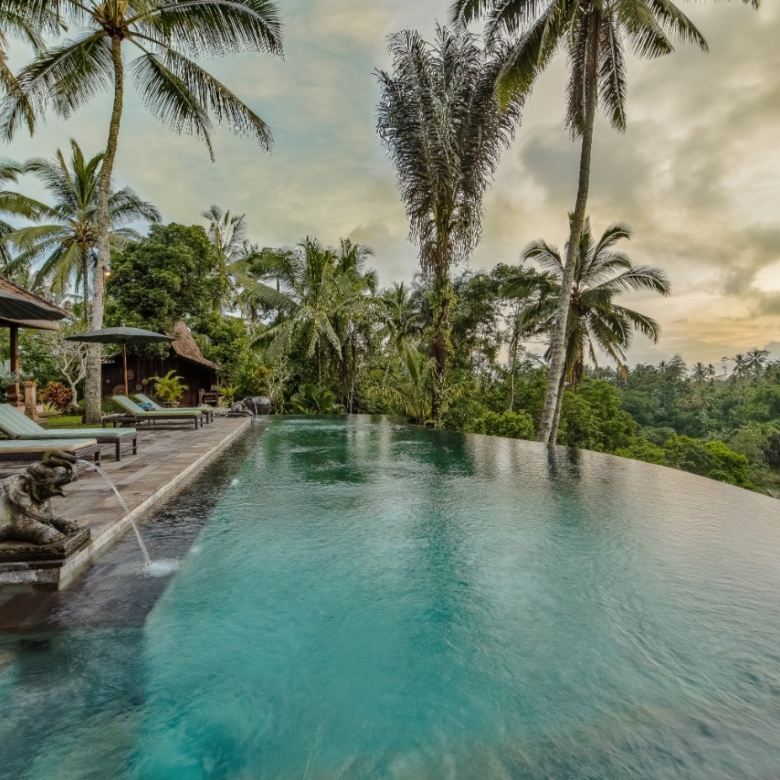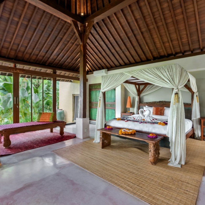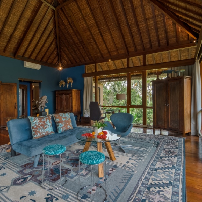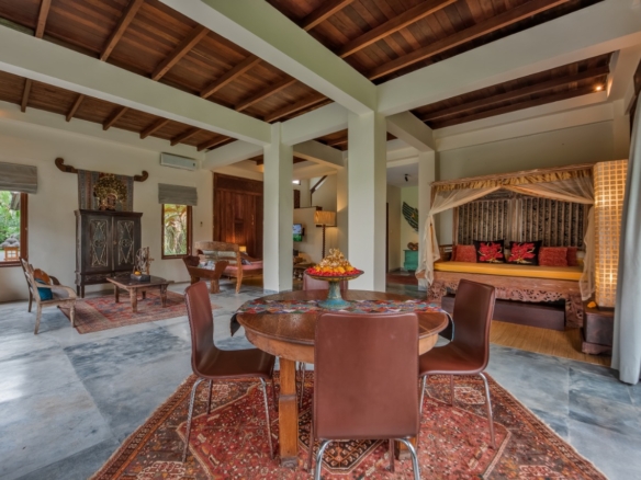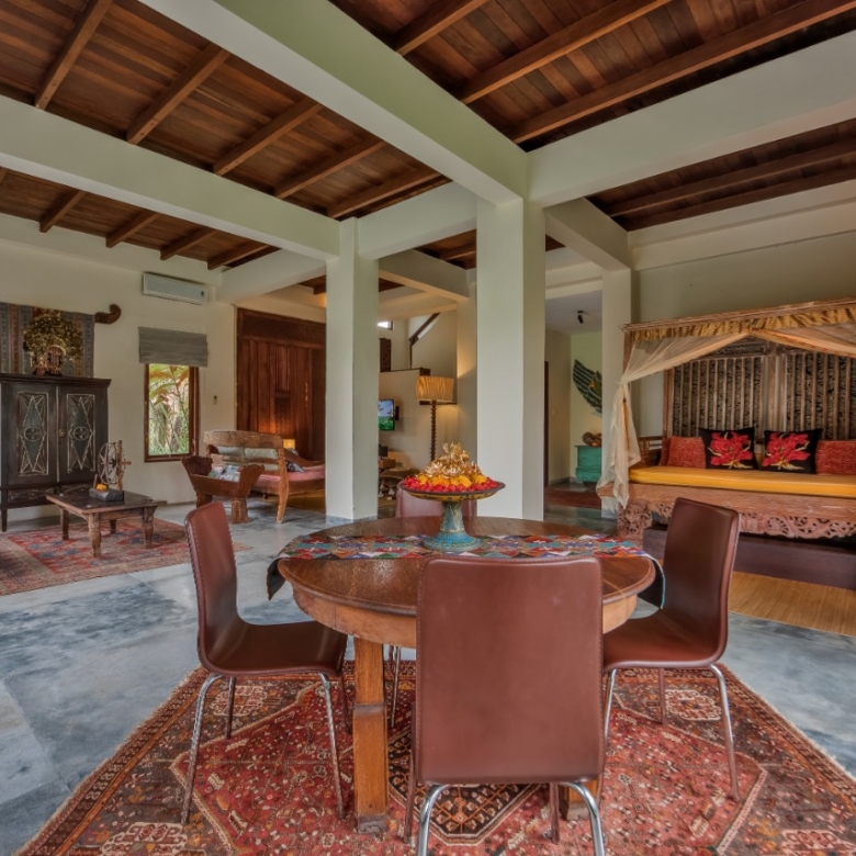 The living and dining areas of this west facing estate can be found in a beautifully carved teak wood Joglo overlooking the 12m x 5m infinity pool and the valley and jungle views beyond. The property has 4 private ensuite cottage suites – each offering a distinctive ambience. One of the cottages is a rare heritage gladak, exquisitely updated for contemporary comfort. Originally built in 1863, its sturdy teak walls and hand-tooled beams were once the foundation of a Balinese home. Another cottage suite is an airy abode beautifully accented with hand-carved teak. Soft lights draw your gaze upward to vaulted rafters inspired by the traditional Balinese home.