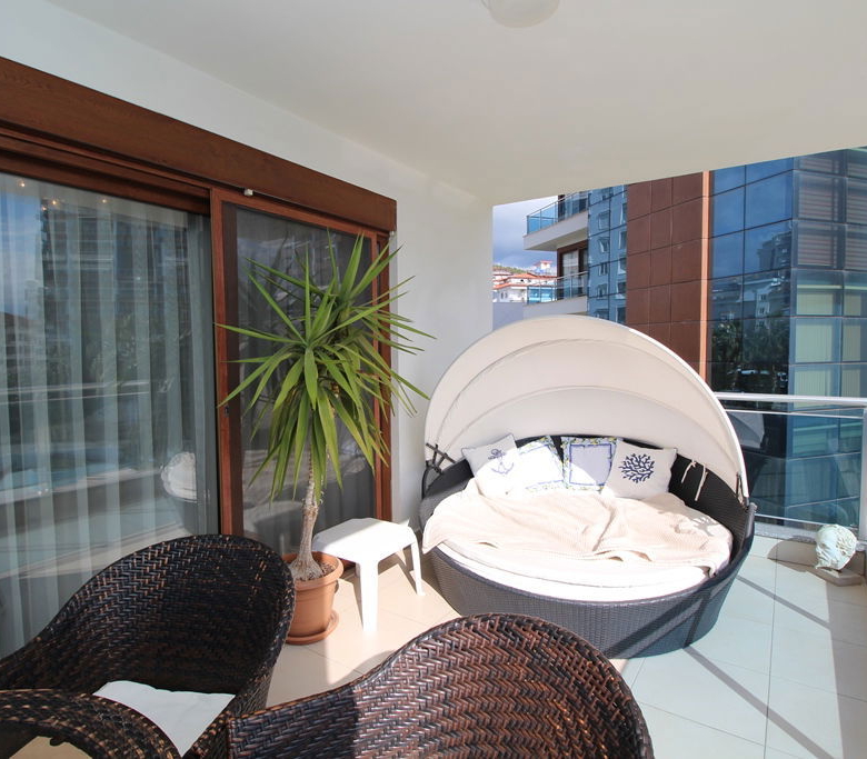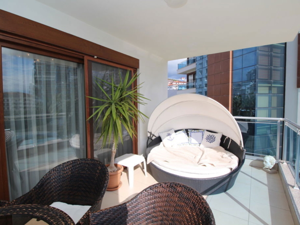 Perhaps one of the apartment’s highlights, the balcony has been styled to feel like a private resort. Rattan chairs and a rounded lounge seat create an inviting, relaxed space. On warm Alanya evenings, this becomes the go-to corner for tea, conversation, or simply watching the sunset.