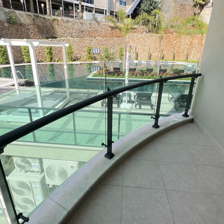 The 12 m² balcony offers plenty of space for outdoor dining or lounging. Furnished withrattan-style table and chairsand a hanging swing chair, the balcony providesviews of the surrounding city and mountains, creating a perfect setting for morning coffee or sunset relaxation.