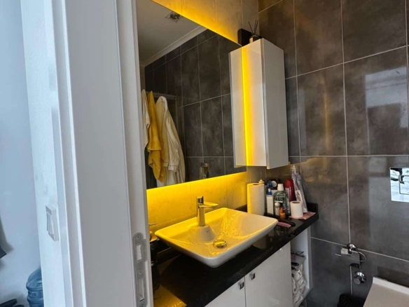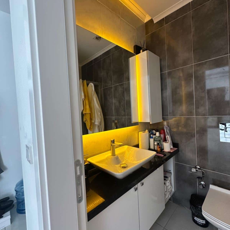 The apartment is equipped with recessed spotlights throughout, creating a sleek and modern feel. However, adding a statement chandelier in the living room or soft bedside lamps in the bedroom can provide warmer ambiance. Decorative details—such as wall art, plants, and textiles—can transform the apartment from minimalist to inviting without losing its modern elegance.
