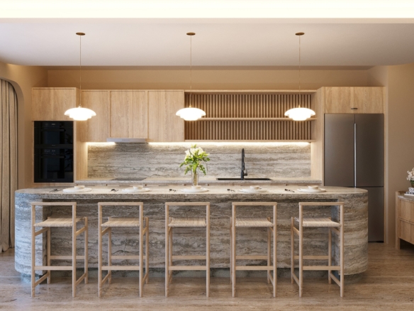 The open-concept living and dining area is crafted for both relaxation and entertaining, featuring premium finishes, sophisticated design elements, and high-end materials that reflect the essence of modern beachfront living. The gourmet kitchen is fully equipped with state-of-the-art appliances, sleek countertops, and custom cabinetry, ensuring both style and functionality.