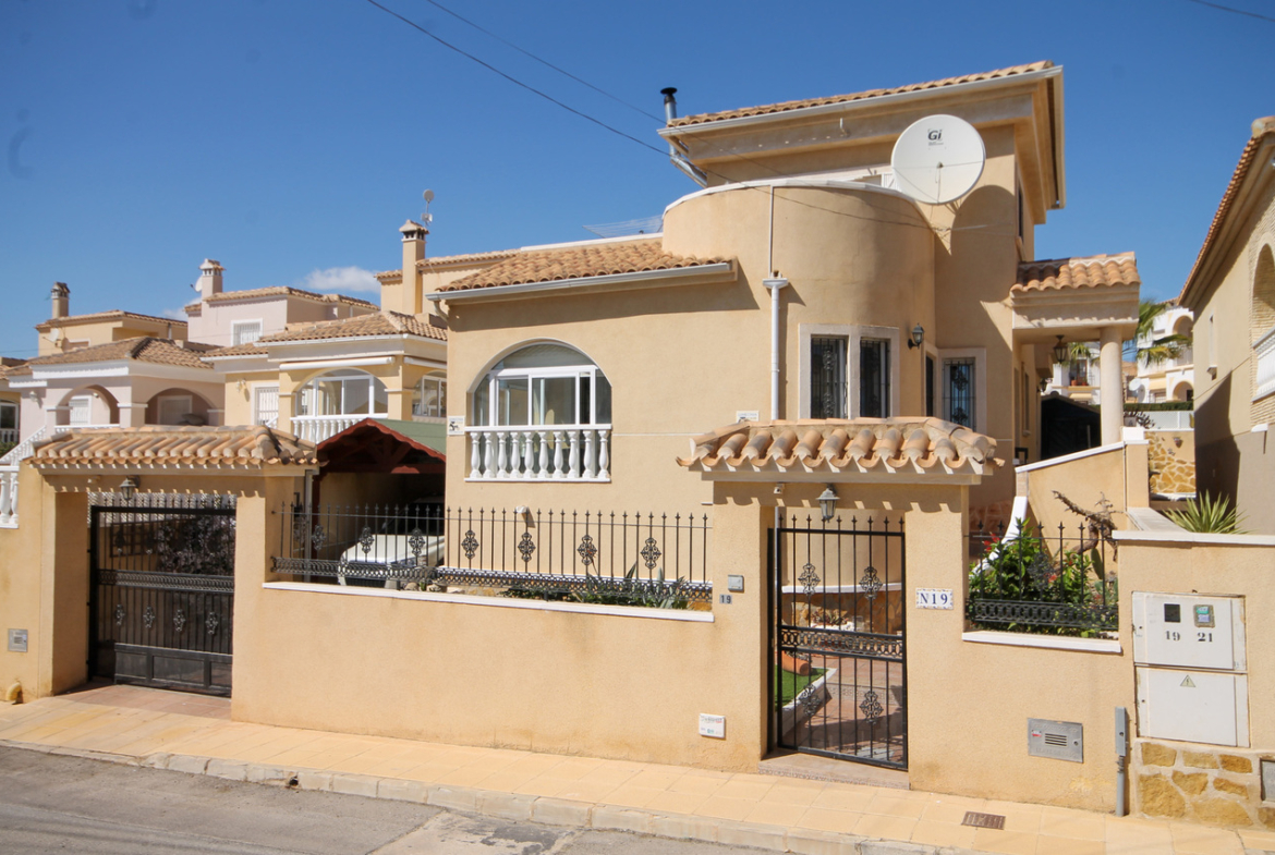 It comprises of a spacious lounge diner with log burner, through to a cosy enclosed terrace with sea view. Adjacent to the lounge is a modern kitchen which leads out to the rear garden and pool. Also off the lounge is a shower room and two double bedrooms with fitted wardrobes. On the first floor you will find the master bedroom with an en-suite shower room. Patio doors open onto the large wrap around solarium which enjoys wonderful sea views towards Campoamor. Outside, and at the rear is a spacious swimming pool, along with a shower room, large barbeque area and a bar with patio furniture. To the front of the villa there is off road parking with a car port and storage shed. The villa is in excellent condition and also benefits from new air conditioning, modern bathrooms, sun awnings, electric window blinds, gas central heating, electric driveway gate and modern flooring. It is tastefully furnished and most of it is included in the sale. Viewing highly recommended. No Community fees. Suma: 280€